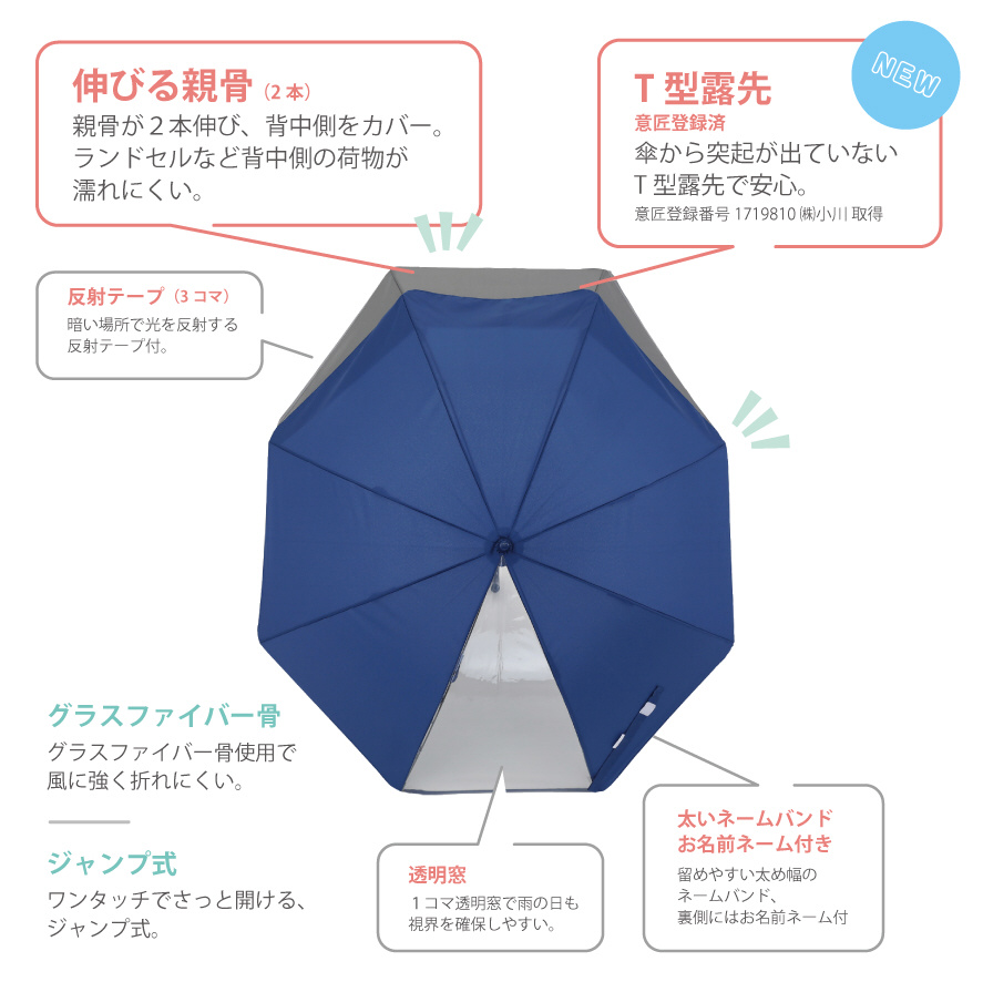 傘を開くと、親骨2本がスライドして伸びます。後ろが大きく広がるので、ランドセルやリュックを雨から守ります。突起の無い露先で安心。3コマ反射テープ付きで暗い場所で光を反射します。 1コマ透明で視界を確保しやすいです。ネームバンドは太め幅で、裏側にはお名前ネーム付きです。グラスファイバー骨使用。