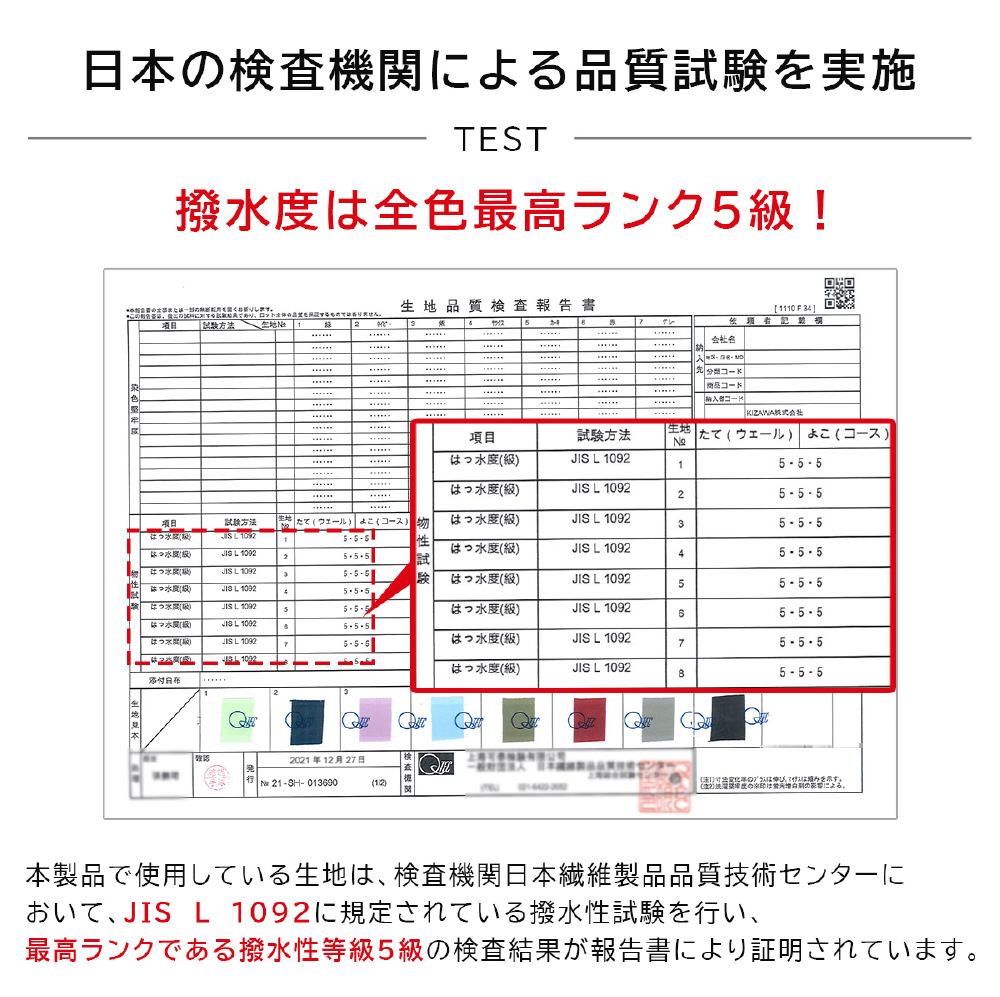 本製品で使用している生地は、検査機関日本織維製品品質技術センターにおいて、JIS L 1092に規定されている撥水性試験を行い、最高ランクである撥水性等級5級の検査結果が報告書により証明されています。