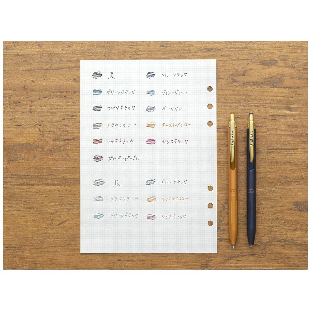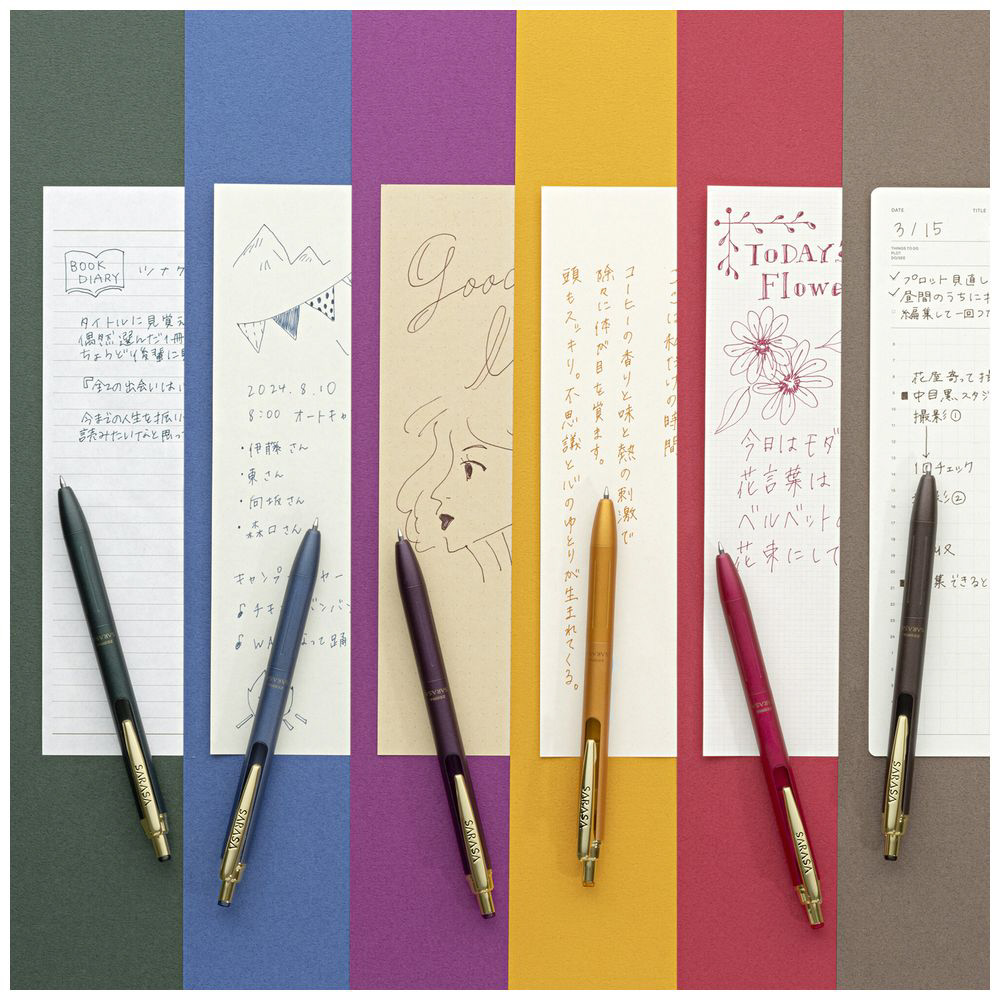 「サラサグランド」は、2020年に発売したジェルボールペンです。ゼブラの人気ボールペン「サラサ」ならではのさらさらさとした書き心地はそのままに、高級感のあるデザインと、おしゃれなビンテージカラーのインク色が特長です。