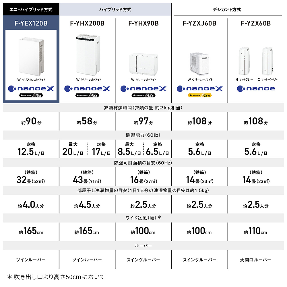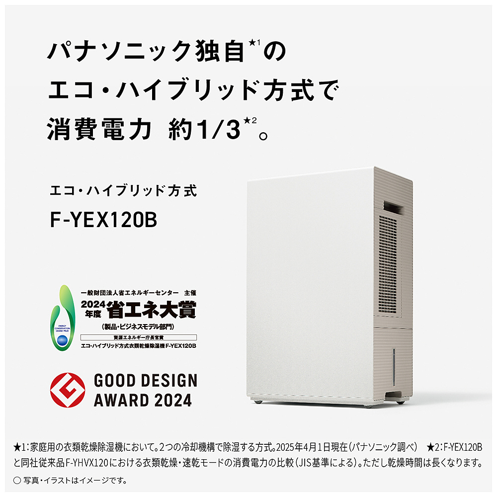 ※1:〈除湿性能〉JIS基準による除湿量12.5L/日の消費電力、F-YEX120B(225W)と当社従来品F-YHVX120(715W)との比較。〈衣類乾燥性能〉JEMA自主基準[JEMA-HD090:2017](60Hz20℃・衣類量約2kg)における消費電力量と乾燥時間、F-YEX120B(312Wh・約90分)と当社従来品F-YHVX120(885Wh・約75分)との比較。なお、実使用時の乾燥時間は、設置環境や衣類の種類・量・干し方により異なります。