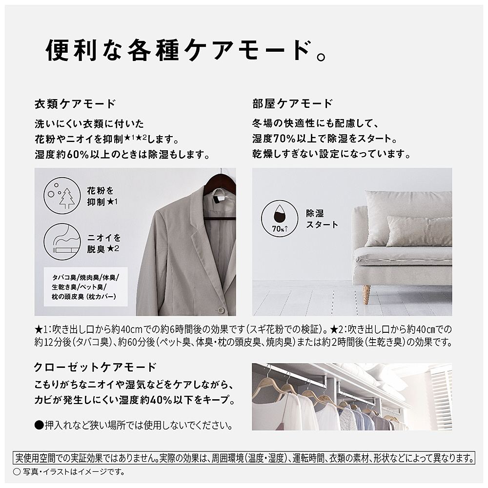※2:【試験機関】(一財)北里環境科学センター【試験方法】6畳の実験室において、吹出口から40cmの位置で、布に付着させた菌数を測定【除菌の方法】ナノイー放出と衣類乾燥運転(衣類乾燥・音ひかえめモード)【対象】布に付着させた菌【試験結果】7時間で99%以上抑制 北生発21_0290_2号。