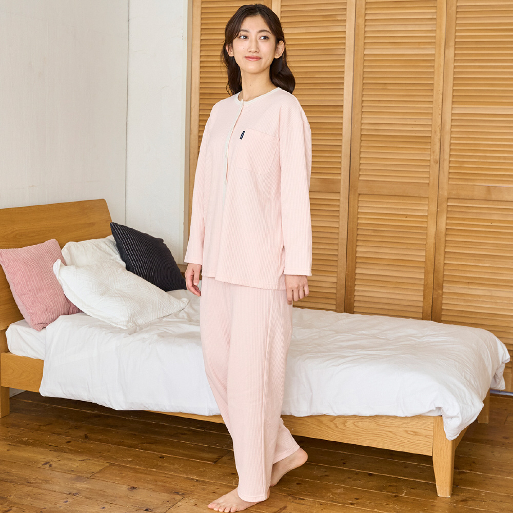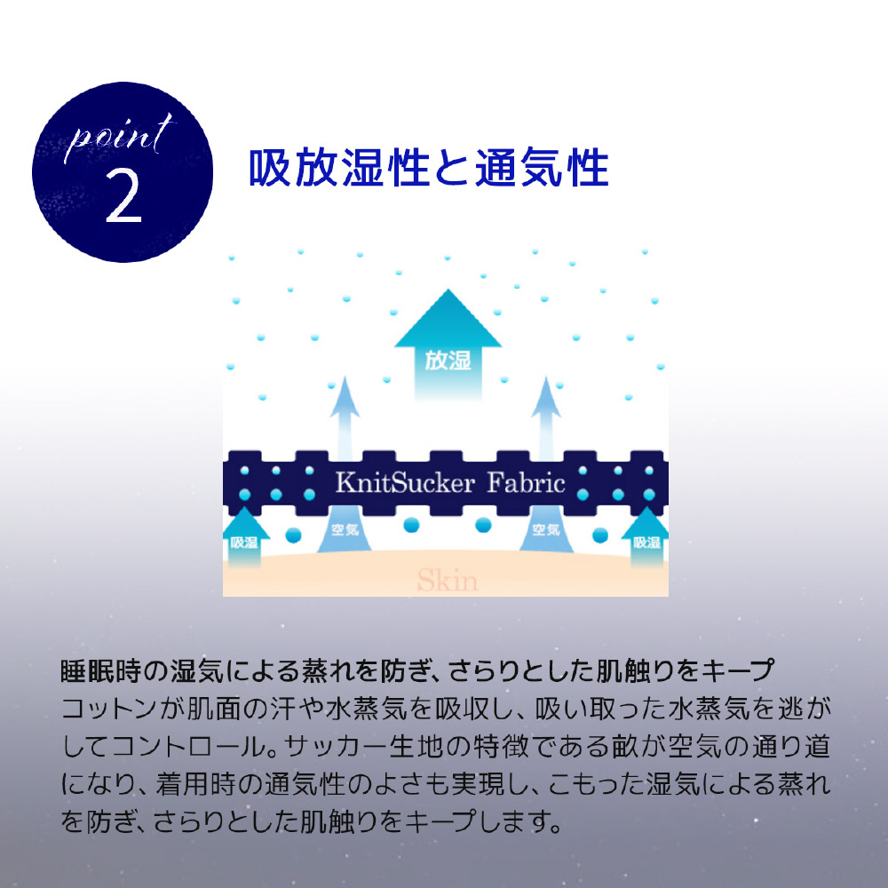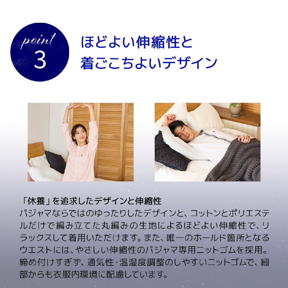 衣服内気候を整え、就寝時の身体の動きを妨げないようパジャマならではのゆったりしたシルエットに仕上げました。