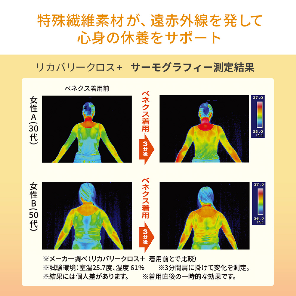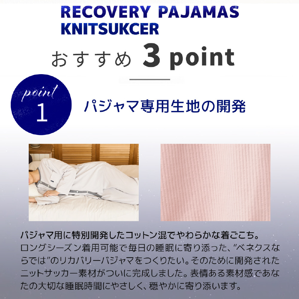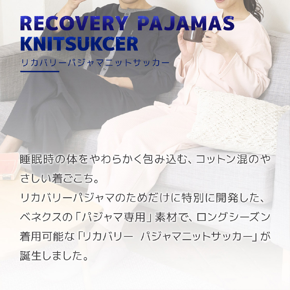 リカバリー機能と吸水/吸放湿性を兼ね備えた、コットン混のやわらかな風合い。休養を追求するベネクスだからこそ作ることができた特別なパジャマ「リカバリーパジャマニットサッカー」誕生!
