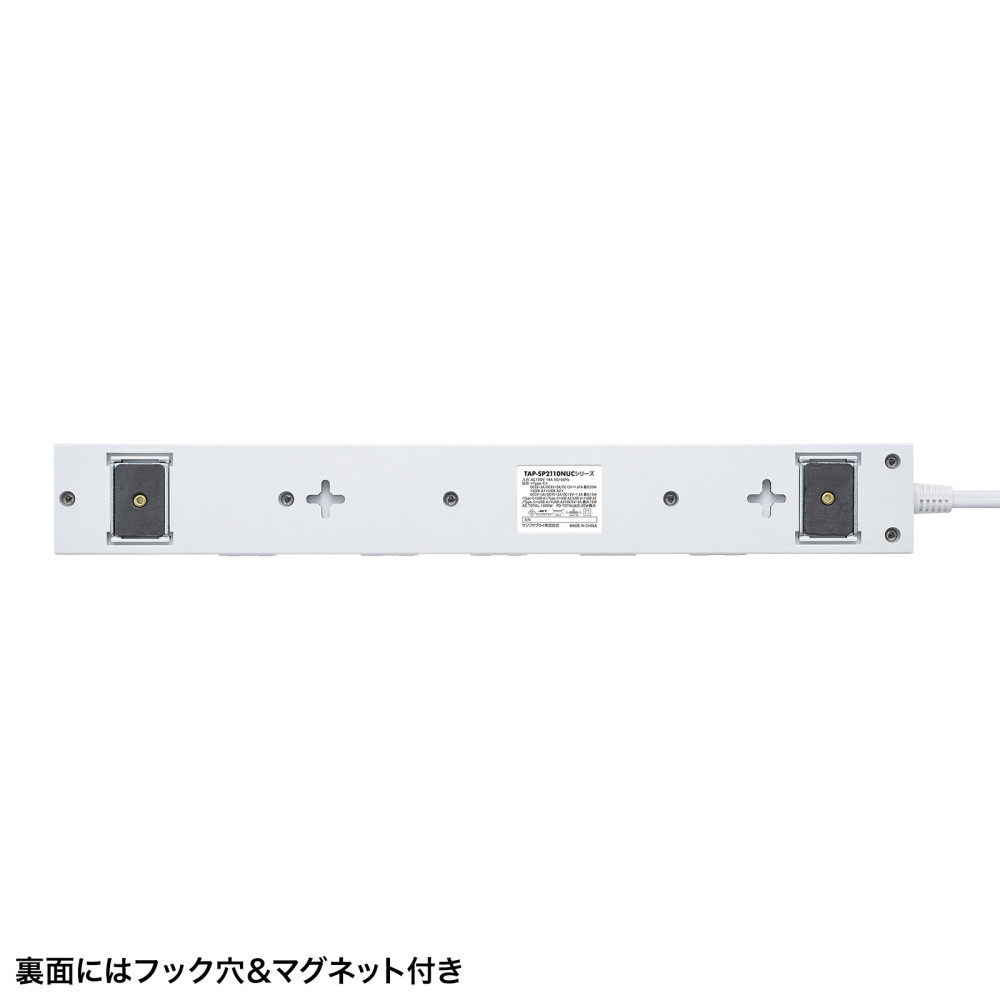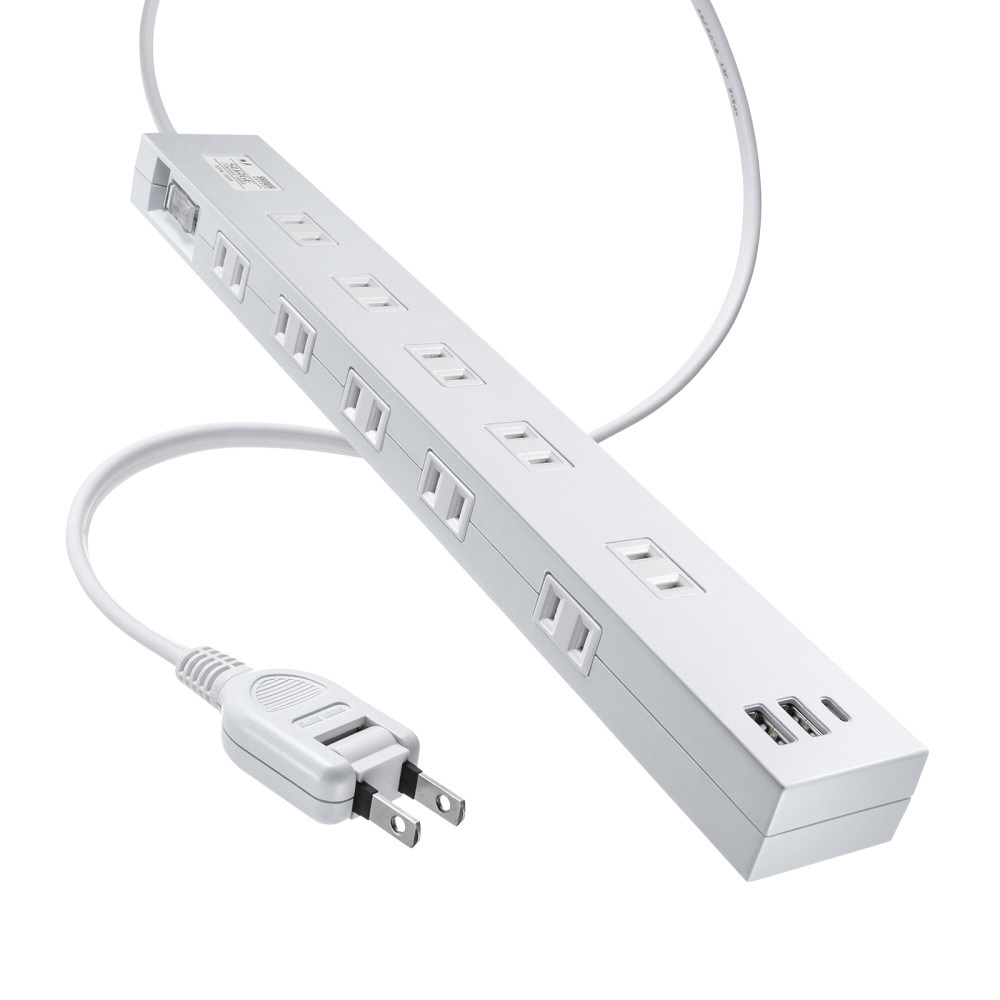 AC10個口にType-CとUSB-Aの充電機能を持つタップ。マグネット付き、雷ガード、一括集中スイッチ&ブレーカー付き。