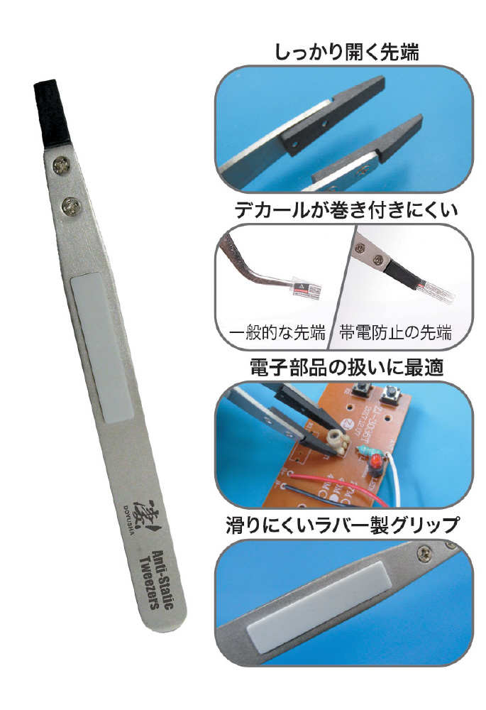 電子部品や、デカールの貼り付けに便利。特に先端ワイドはしっかりキャッチ!