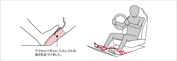 フットレスト高を運転時のアクセルペダルに近づけることで、人と車の一体感を増しました。ステアリングやペダルの正確な操作が要求されるレースシーンでファイティングポーズを確保できます。