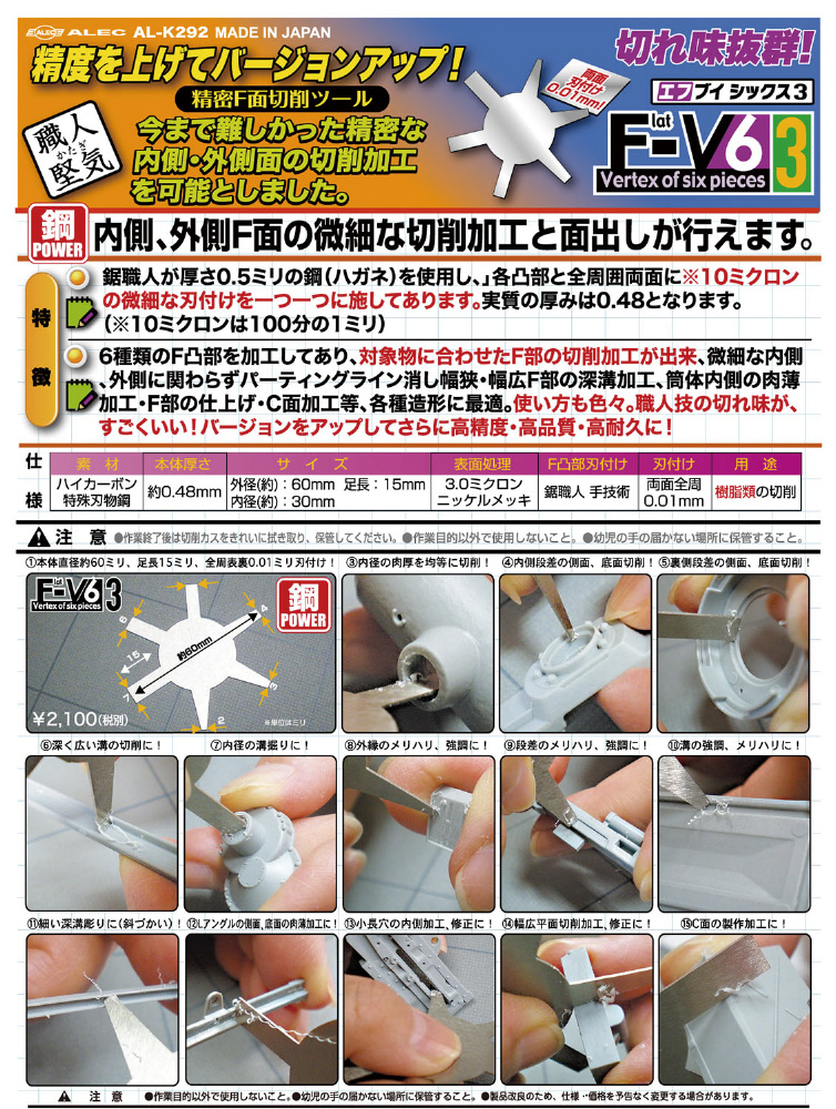 6種類のF凸部を加工してあり、対象物に合わせたF部の切削加工が出来、微細な内側、外側に関わらずパーティングライン消し幅狭・幅広F部の深溝加工、筒体内側の肉薄加工・F部の仕上げ・C面加工等、各種造形に最適。使い方も色々。職人技の切れ味が、すごくいい!バージョンをアップしてさらに高精度・高品質・高耐久に!