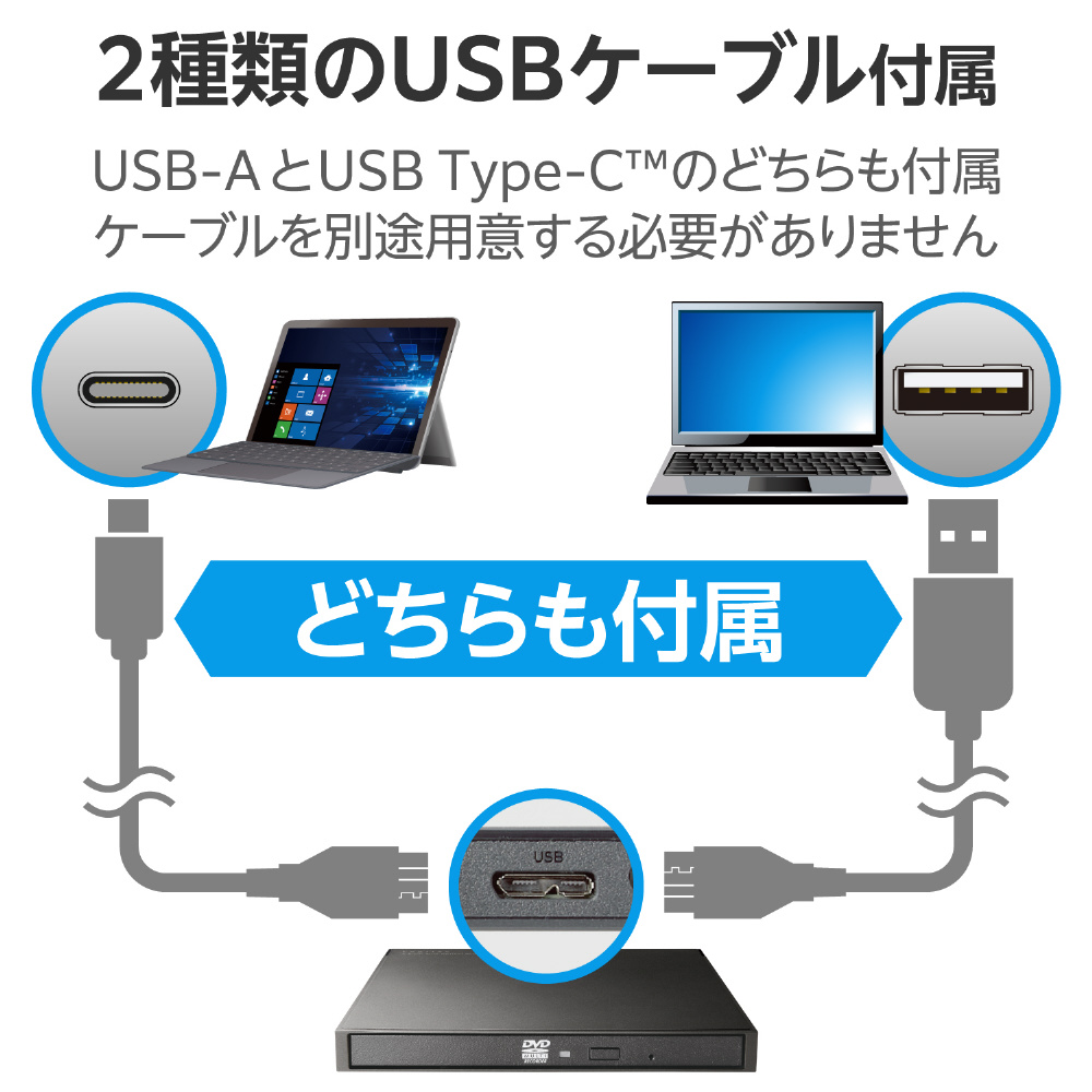 あらゆるPCユーザーにお使いいただけるよう、USB Type-AケーブルとUSB Type-Cケーブルの2種類のUSBケーブルを標準添付。Type-Aポート、Type-Cポートのどちら搭載のPCでも、ケーブル1本で接続できます。