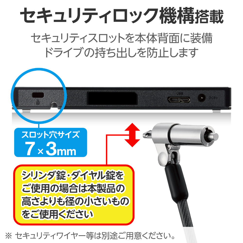 製品背面にケンジントンロックのスリットを設けブルーレイドライブの持ち出しを防止します。