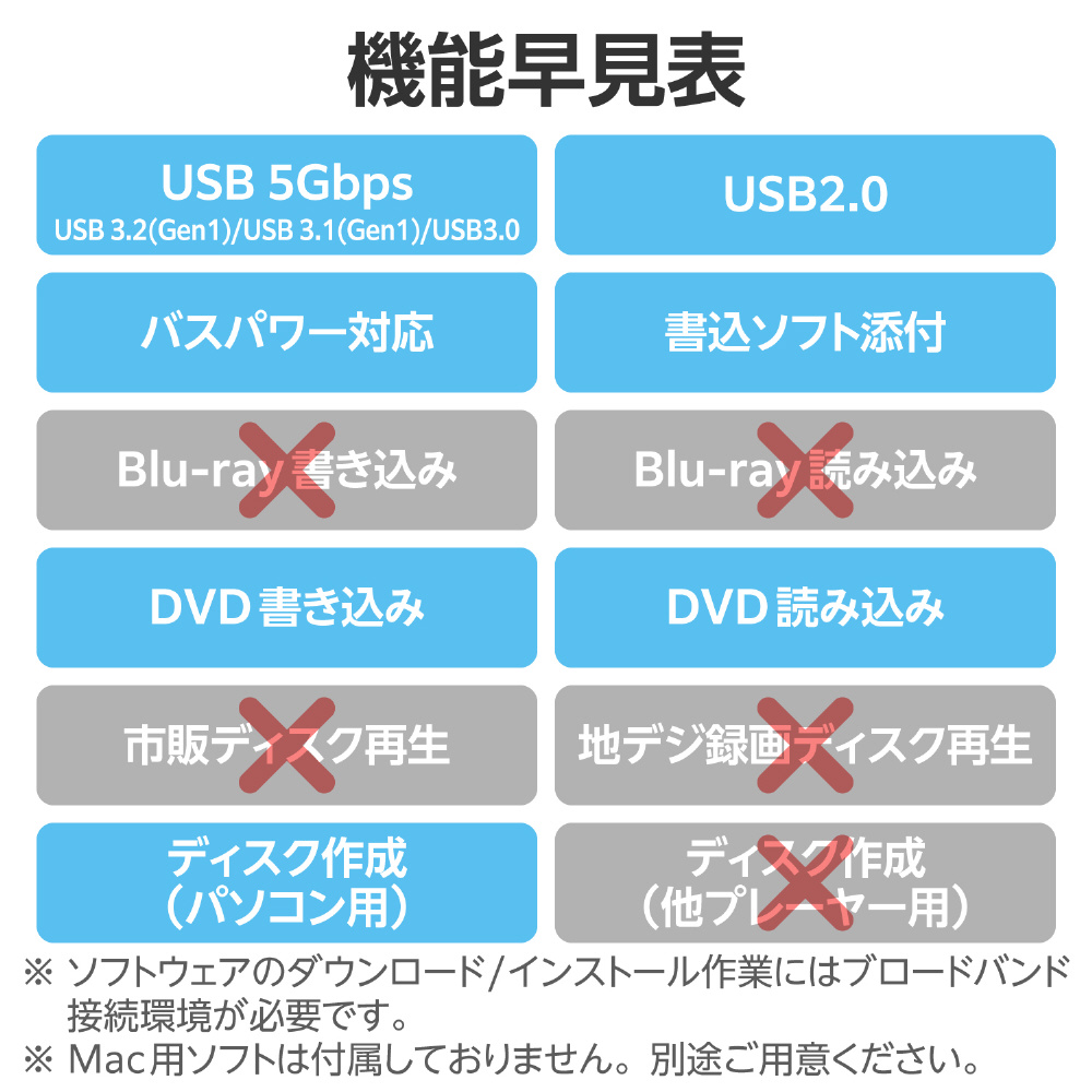 国内最軽量、最小クラスのコンパクト設計のUSB3.2(Gen1)ポータブルDVDドライブ。USBケーブルを2本標準付属し、USB Type-C(TM)/Type-AどちらのUSBポートでも使用可能。データ書込ソフトを無償でダウンロード提供。パソコン内の大切なデータをディスクへバックアップしてセキュリティ保護も可能。Surfaceシリーズなど光学式ドライブを搭載していないノートパソコンに最適。