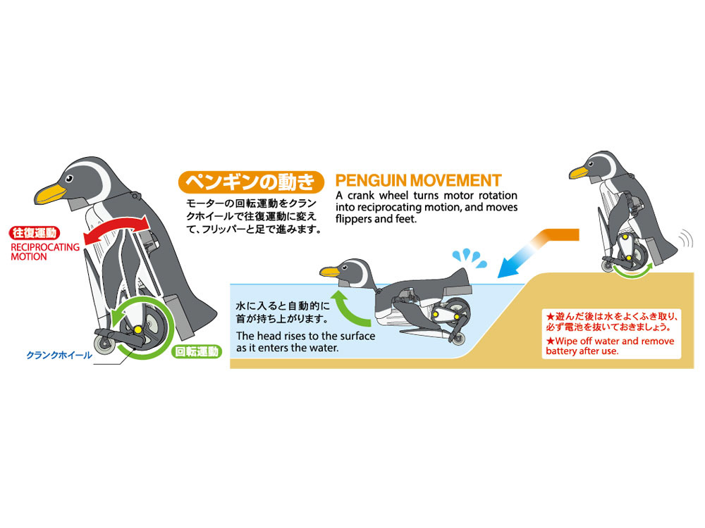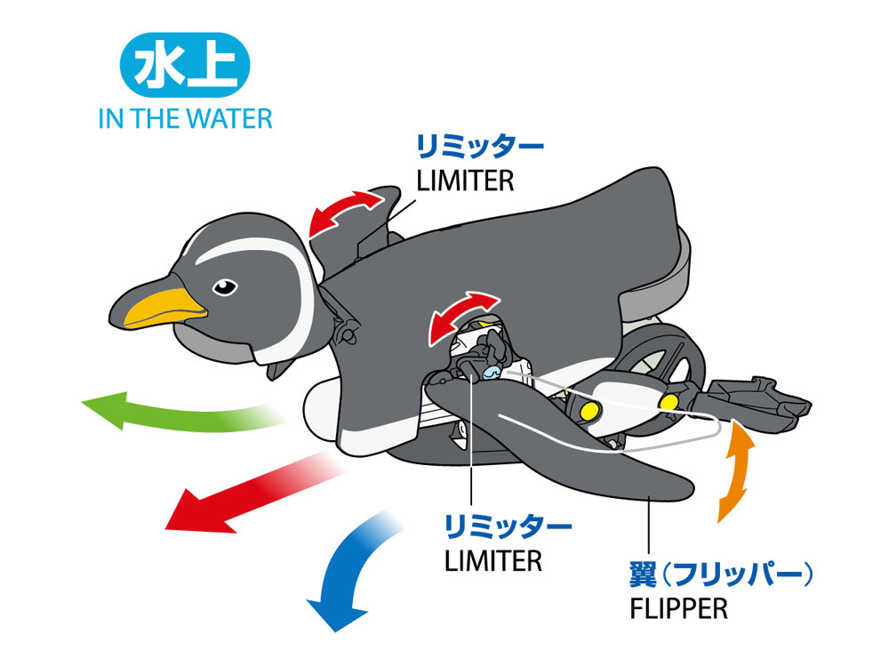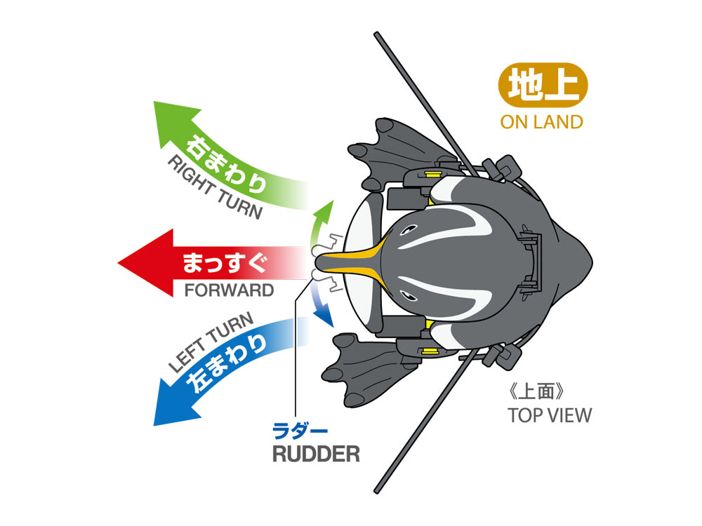 水中モーターのパワーをギヤボックスから両足に伝え、足を交互に動かして元気に前進。水の上では頭を上げてフリッパー(翼)で泳ぎます。しかも、お腹のラダーの向きを変えれば左まわり・右まわりもOK。必要な部品はすべてセットされ、ビス止めとはめ込みだけで完成します。