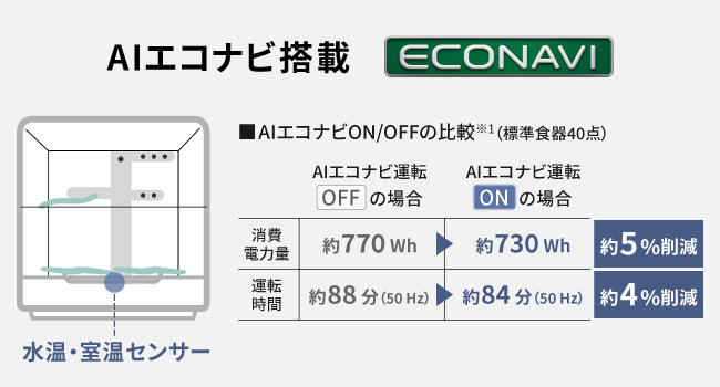 ※1●NP-TH5・TA5(「汚れレベル2」、エコナビ運転OFFの場合):食器点数40点・小物20点、水温20 ℃、食器洗い機専用洗剤を5 g使用する(1箱600 g入り475円(税込))〈当社調べ〉。使用水量は約9.9 L。