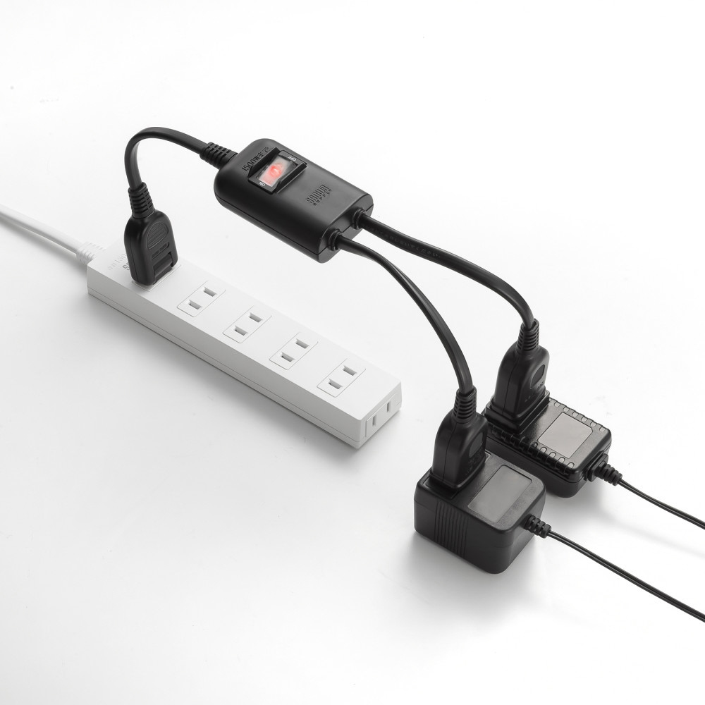 ACアダプタ使用時に無駄なく設置できる分岐タイプの電源延長コード。一括集中スイッチ付き。