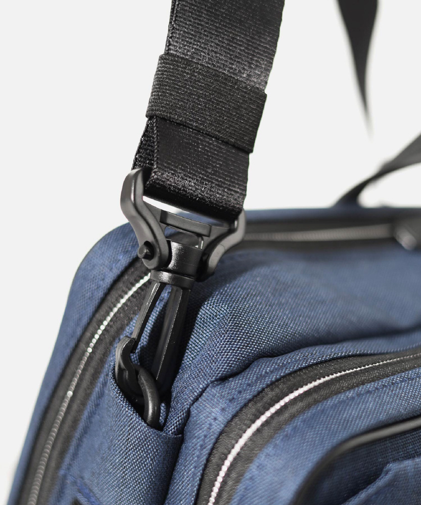 本体素材には、シャンブレー調のポ リエステル生地に撥水加工を施した生地を使用し、軽量に仕上げました。シンプ ルなデザインながらも、2本手ハンドルが隠れる機能が特徴。ハンドルを出し入 れしても型崩れしにくいよう見えない内側にも工夫しています。フロントポケットの内側はパイル地を使用。キズが 付きにくく、スマホなどの電子ツール収納に適したポケットです。全型共通でセッ トアップ対応しているので、出張や旅行にも便利です。