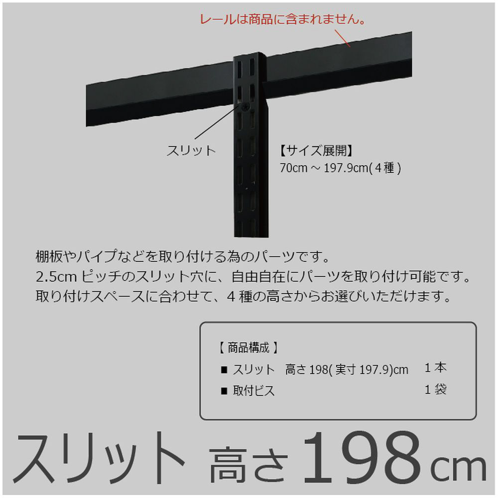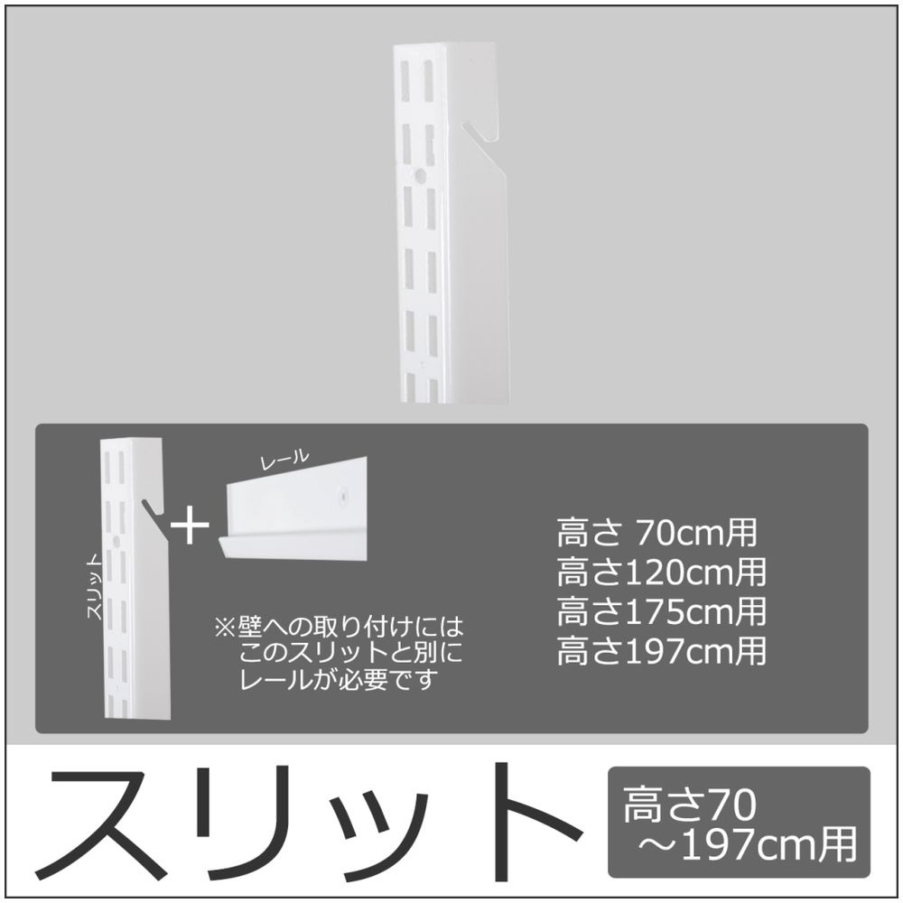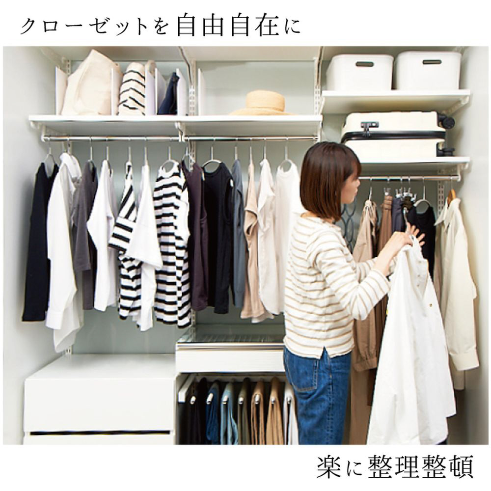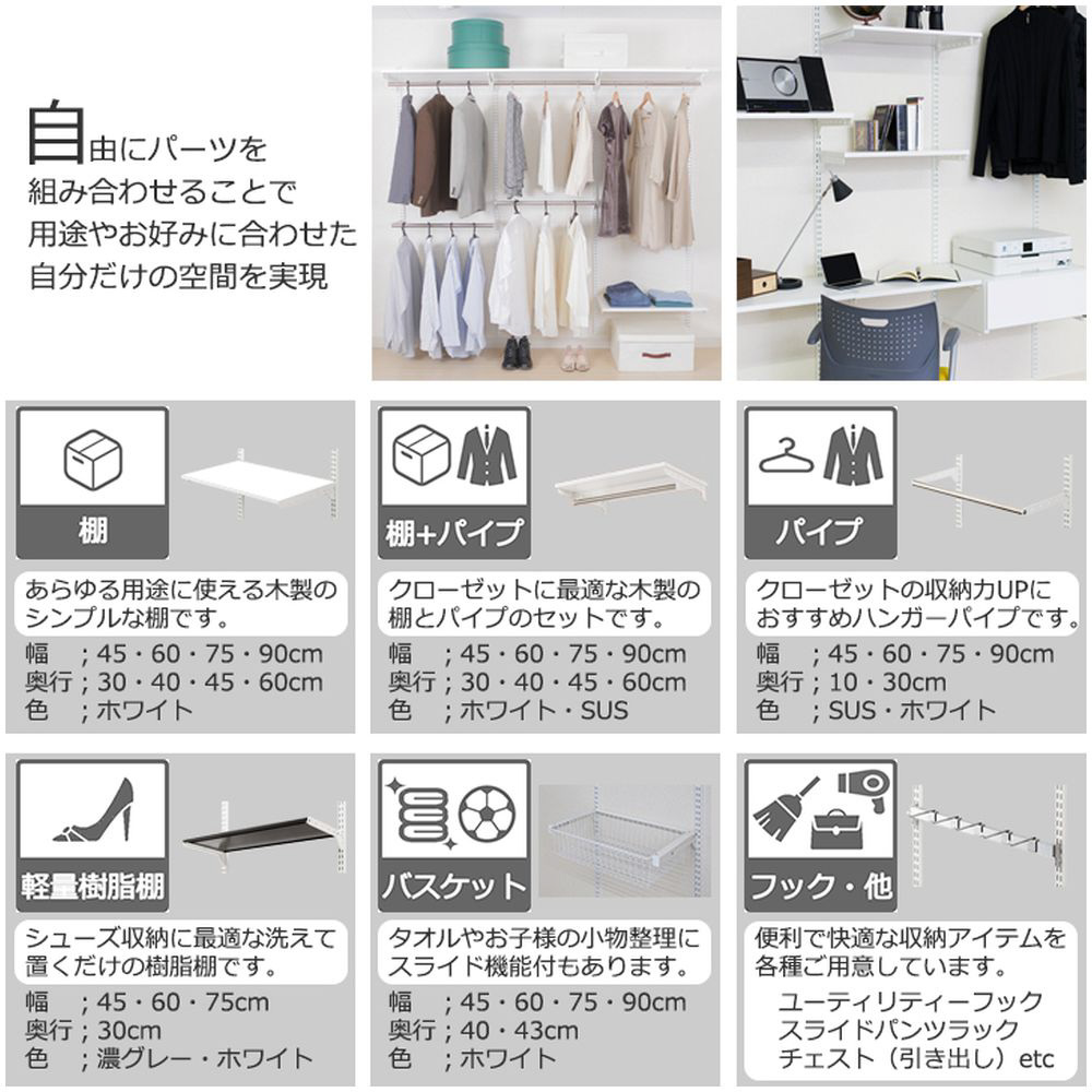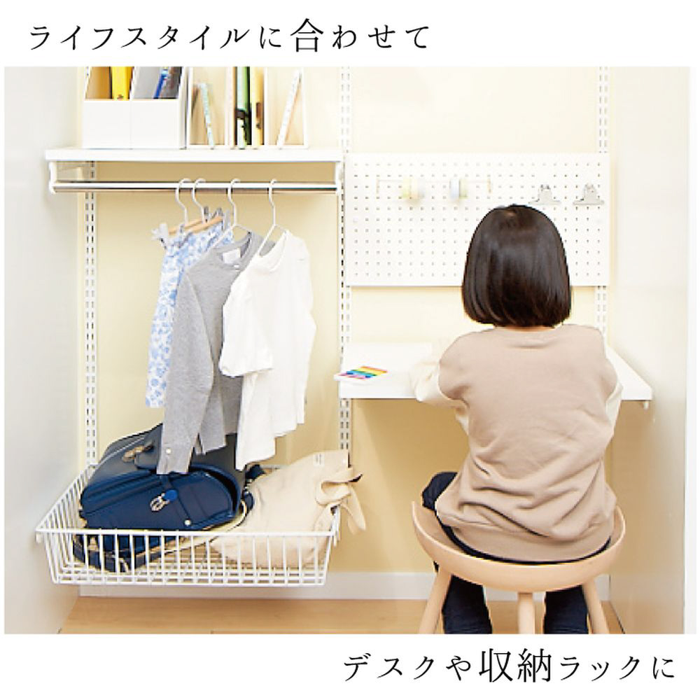 多様なライフスタイルにも対応する豊富なオプションパーツをご用意。基本的な棚板はもちろんシューズ用の棚板、バスケット、引き出し、ハンガー等々、ライフスタイルに合わせて細かいニーズに応えるラインナップです。レール・スリットはホワイトとプラック、棚板はホワイトと木目があり、可能な組み合わせは3通り。クローゼットはホワイトですっきり、リビングはプラックと木目でカッコ良くなど場所ごとに雰匿気を変えることができます。人によって三者三様、一人ひとりの収納の形に合わせて楽しみながら自分だけの収納づくりができます。