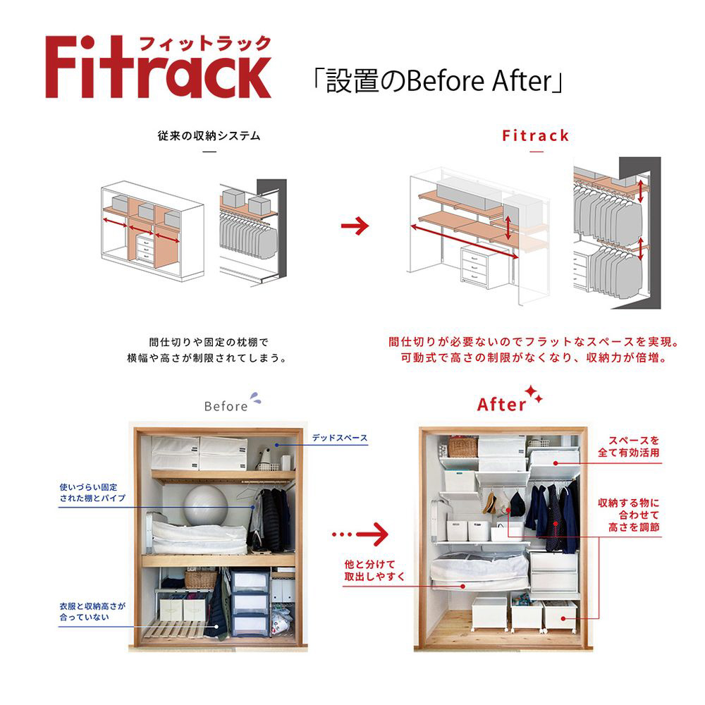 従来の固定式枕棚やバイプ設置タイプの収納システムでは横幅や高さが制限されたり、デッドスペースができたりと制限が多く、物が取り出しづらくなってしまいます。Fitrackは間仕切りが必要ないのでフラットなスペースを実現。また可動式で高さの制限がなくなり、収納力が倍増します。無駄なスペースがなくなることで、収納物も仕舞いやすく、取り出しやすい収納へ生まれ変わります。またライフステージの変化によりくらしが変わってもその都度ぴったりな収納に変更できます。