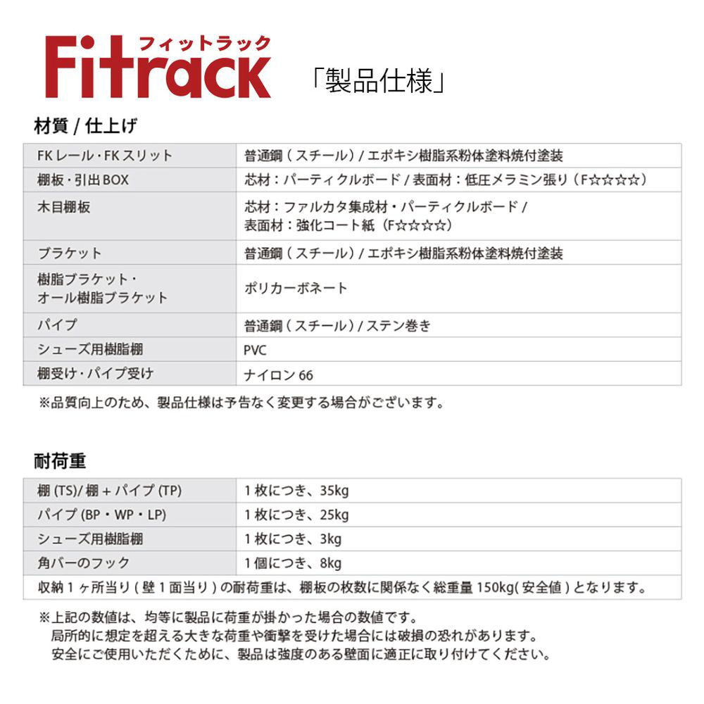 特許取得の独自金物構造で横方向FKレールにも荷重が分散され壁一面あたり150kgの耐荷重を実現。レール自体も従来品よりも頑丈な構造なので住宅で長期間安心してお使いいただけます。F ☆☆☆☆(エフフォースター)の表面材を使用!(ホワイト色:低圧メラミン、木目:強化コート紙)。ホルムアルデヒドの発散濃度が非常に低いため、シックハウス症候群の心配もございません。下からの衝撃や地震の際に棚受けが外れてしまわないように、専用の落下防止ストッパーが付属しています。