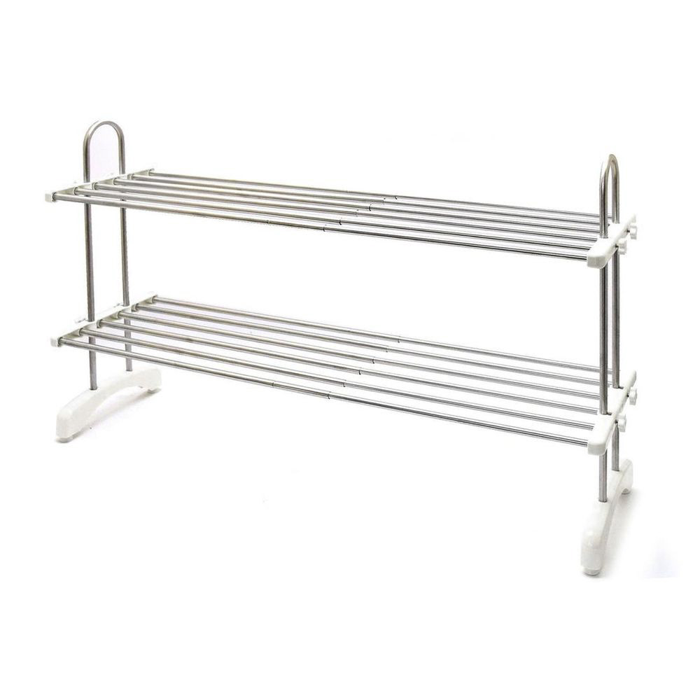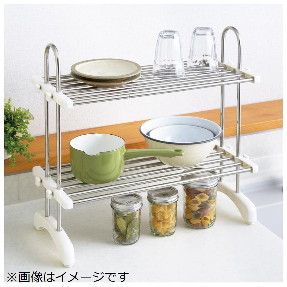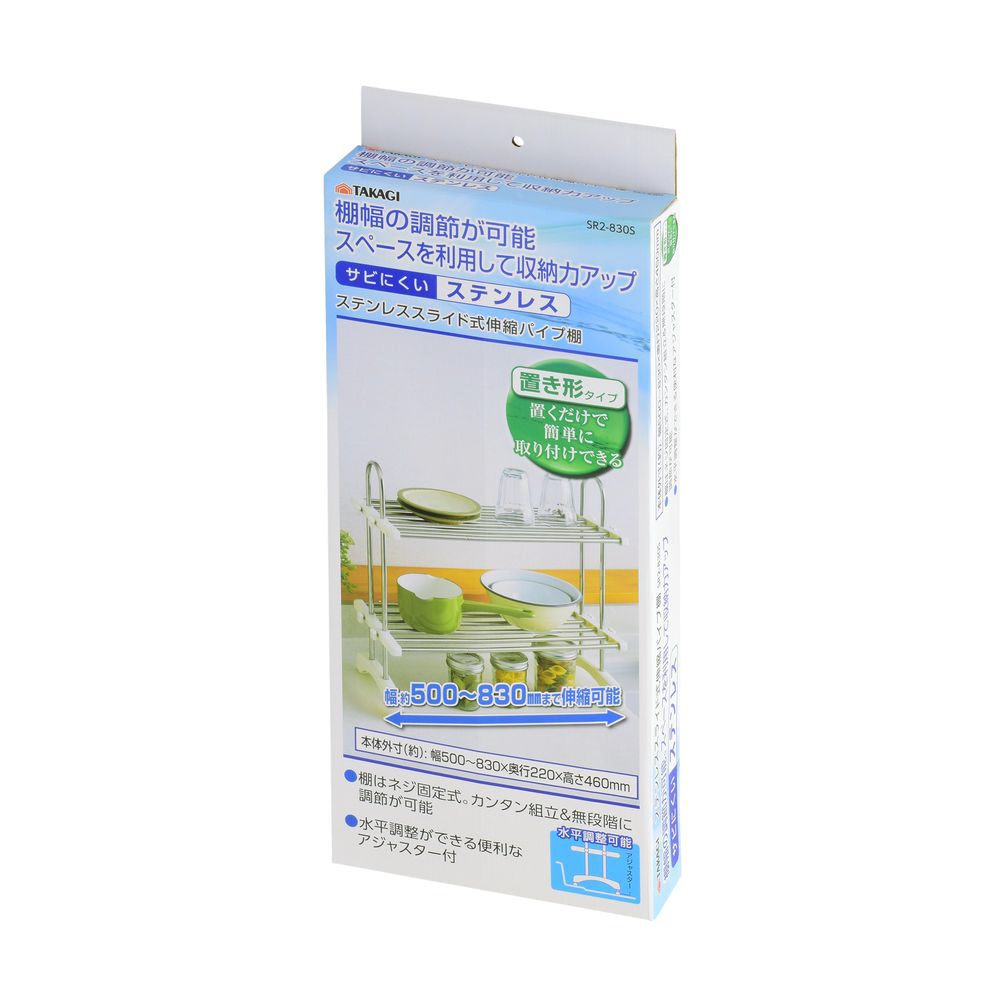 ●サビにくいステンレス製 ●置くだけで簡単に取り付けできる置き形タイプ ●幅約500〜830mmまで伸縮可能 ●棚は棚固定式。カンタン組立&無段階に調節が可能 ●水平調整ができる便利なアジャスター付