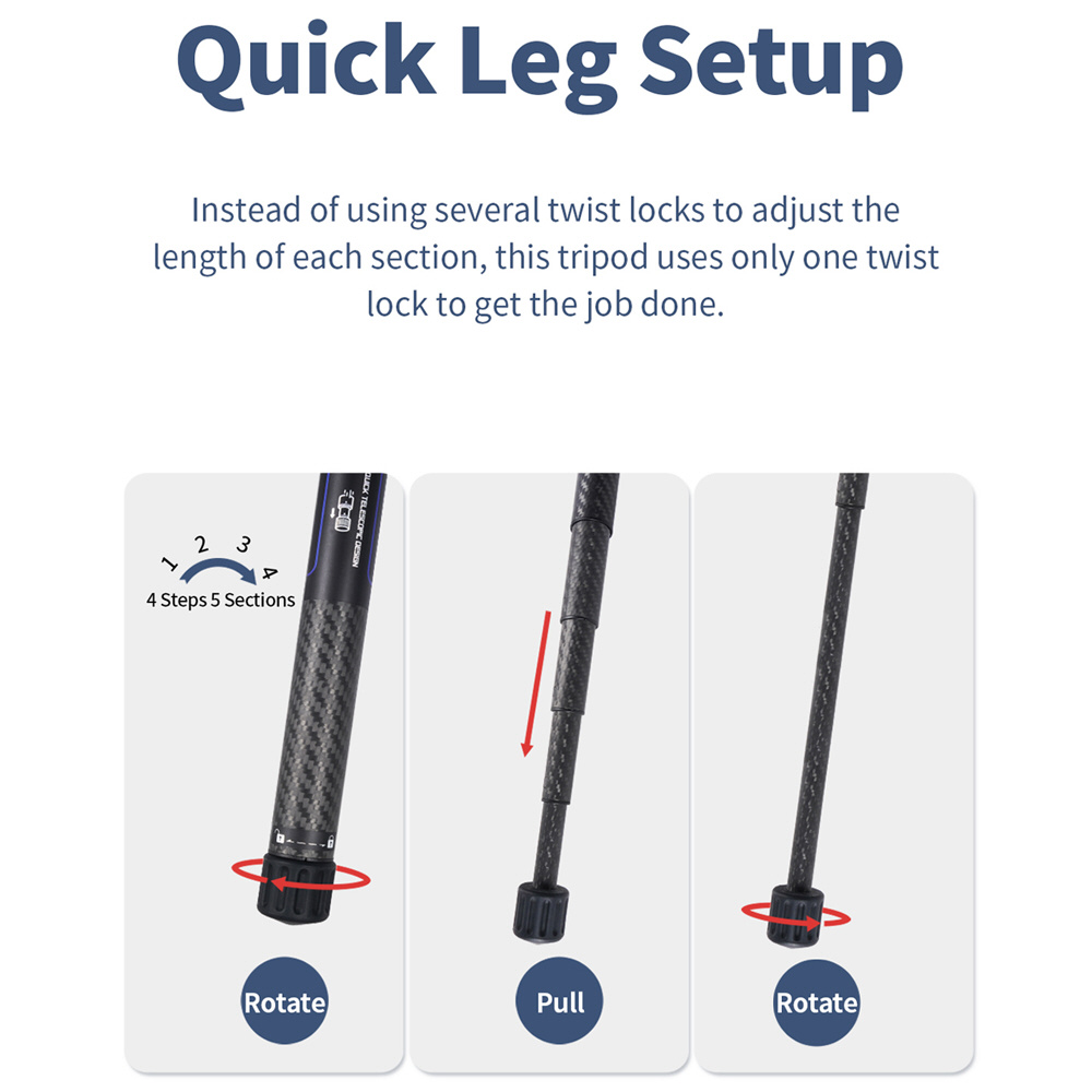 高さを調整するためにいくつかのツイストロックを使用する代わりに、1つのツイストロックで2秒以内に5段の脚を一気に伸縮可能。