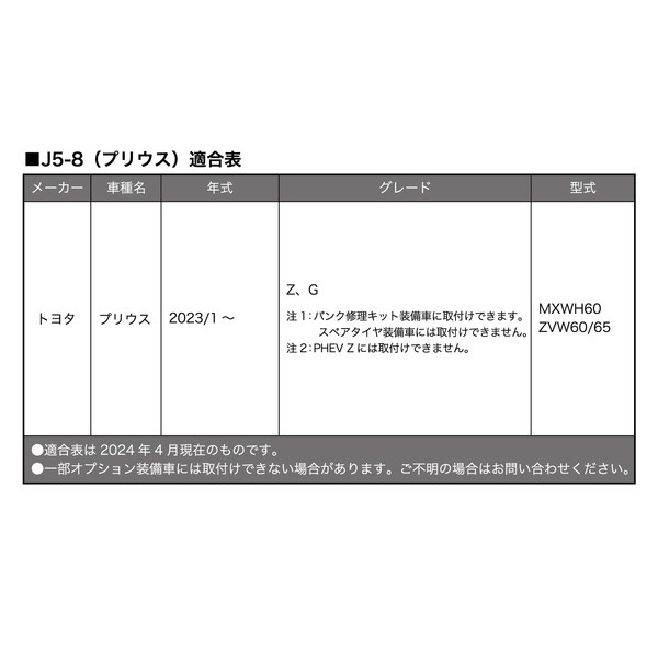 ■適合車種:プリウス [年式]2023/1〜 [型式]MXWH60・ZVW60/65 [グレード]Z(PHEVのZには適合しません)、G  [備考]パンク修理キット装備車に取付けできます。スペアタイヤ装備車には取付けできません。