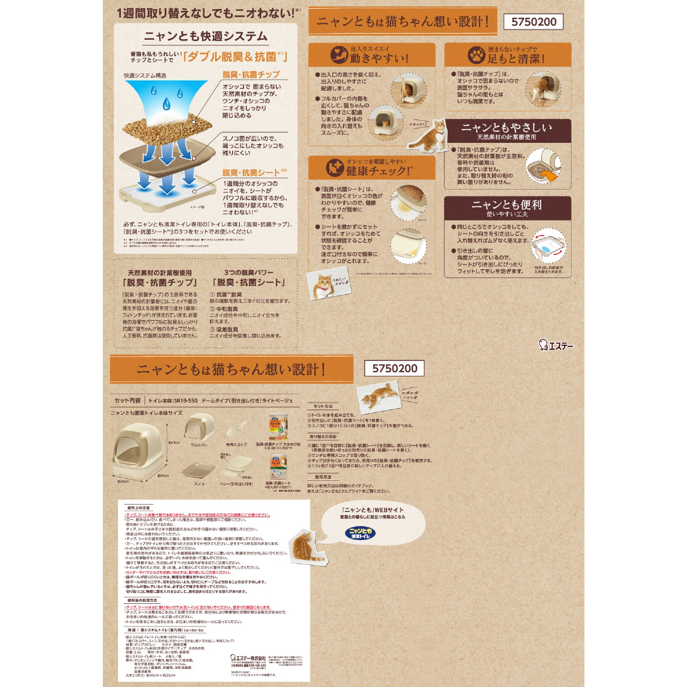 ・猫システムトイレ(トイレ本体:SR19-550)1組(フルカバー、スノコ、引き出し付きトレー(引き出し受け・引き出し)、専用スコップ)