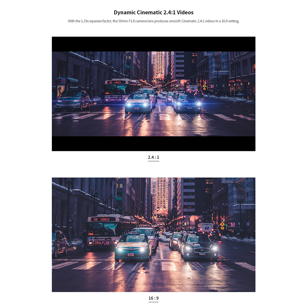1.33倍のスクイーズファクターで水平方向の視野を広げ、ポストクロップなしでよりワイドなフルHD 2.4:1のシネマティックビデオを生成。