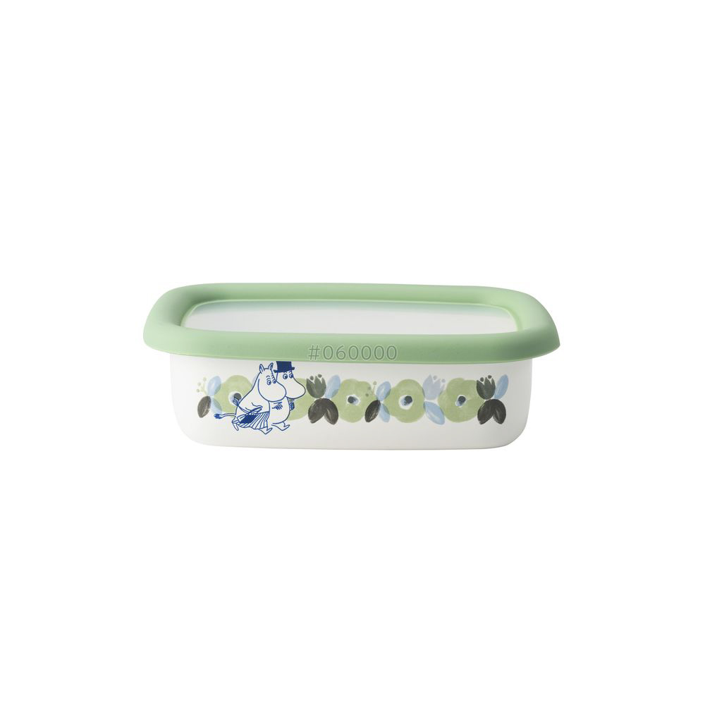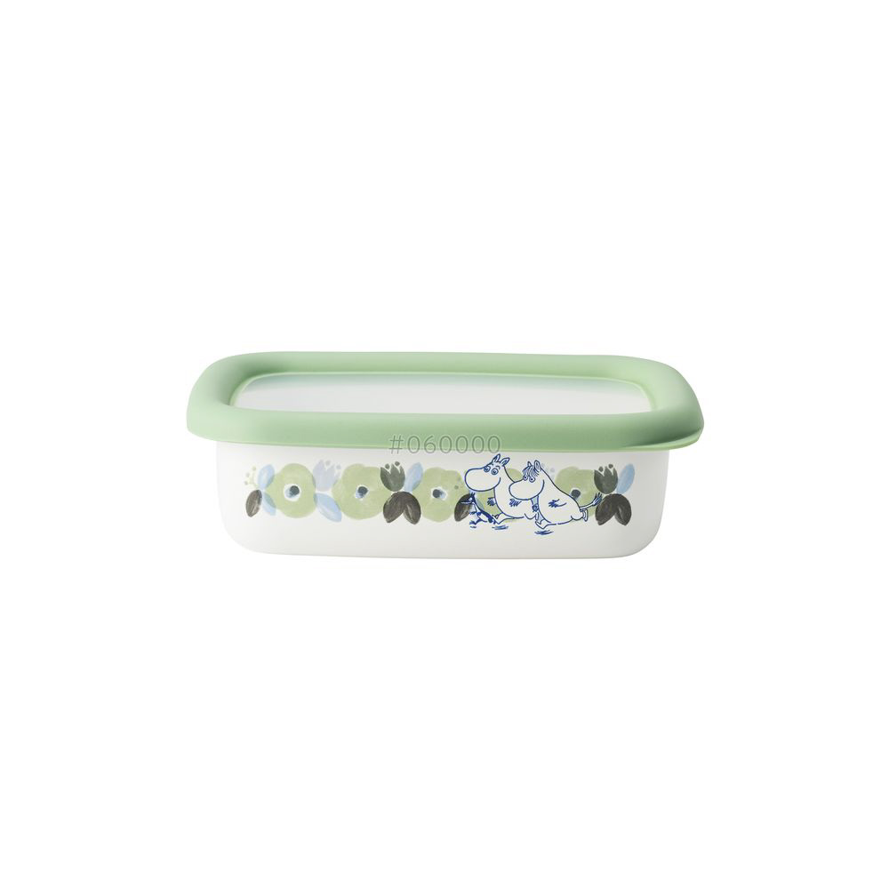 ムーミンフラワーガーデンがデザインされたホーロー製の浅型角容器。