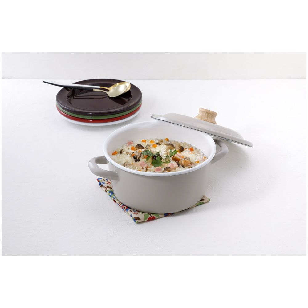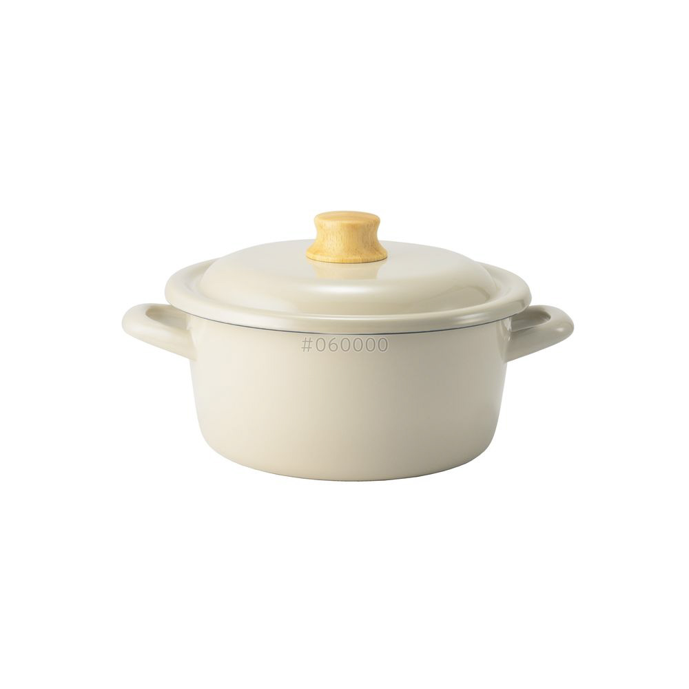 鉄(ほうろう用鋼板)にガラス質を焼き付けたホーローは保温性に優れ酸・塩分に強く、におい汚れも付きにくくついてもスッキリと洗い落とせます。他にないスタイリッシュなくすみ色は飽きがこず末永く使えます。200V電磁調理器との相性も良く効率良く加熱できます。注ぎ口と内側には目安の目盛り付きで便利なマルチに使える両手鍋。本体は(*蓋は除く)オーブン調理も可能です。