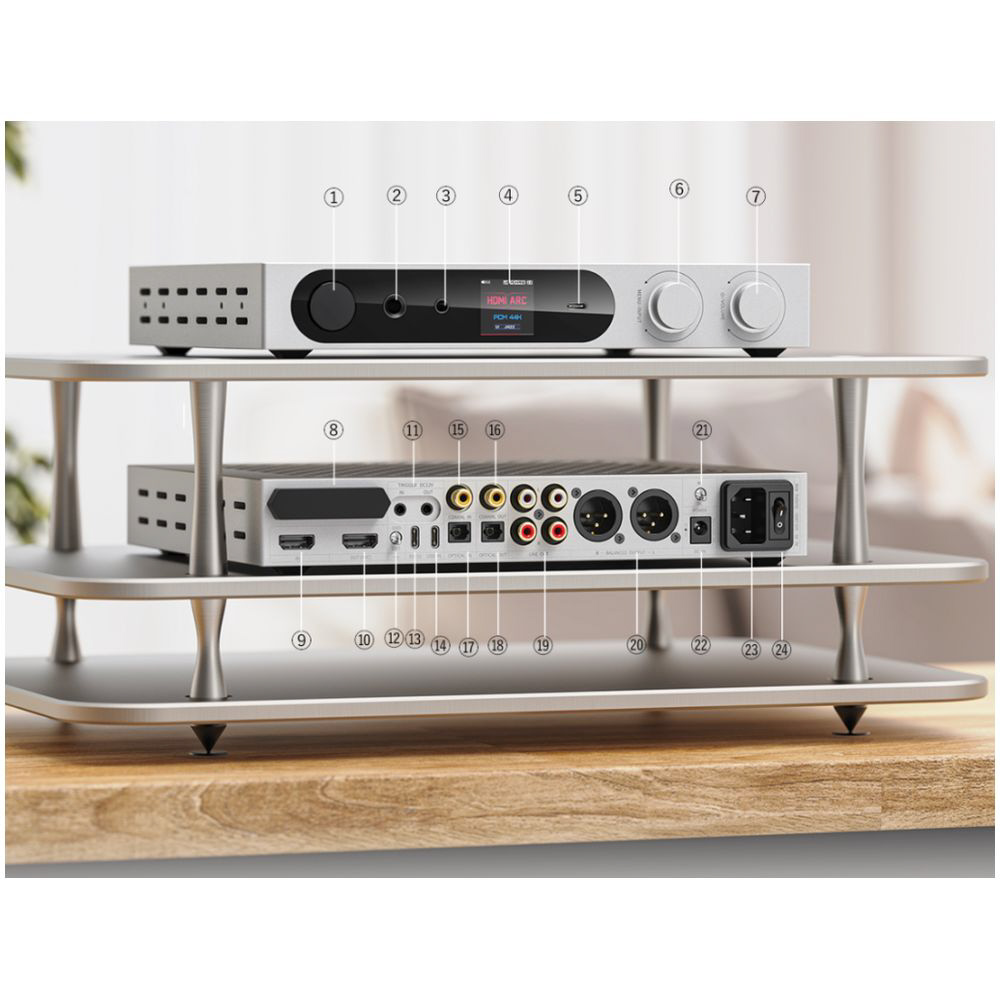 仕様1 対応サンプリングレート:USB Type-C入力:PCM768kHz/32bit、DSD512 (Native) MQAフルデコード、RCA同軸入出力:PCM192kHz/24bit、DSD64、TOS光入力:PCM96KHz/24bit、TOS光出力:PCM192KHz/24bit、HDMI入出力(HDMI1.4b):PCM192kHz/24bit(ARCは48kHz/24bit)