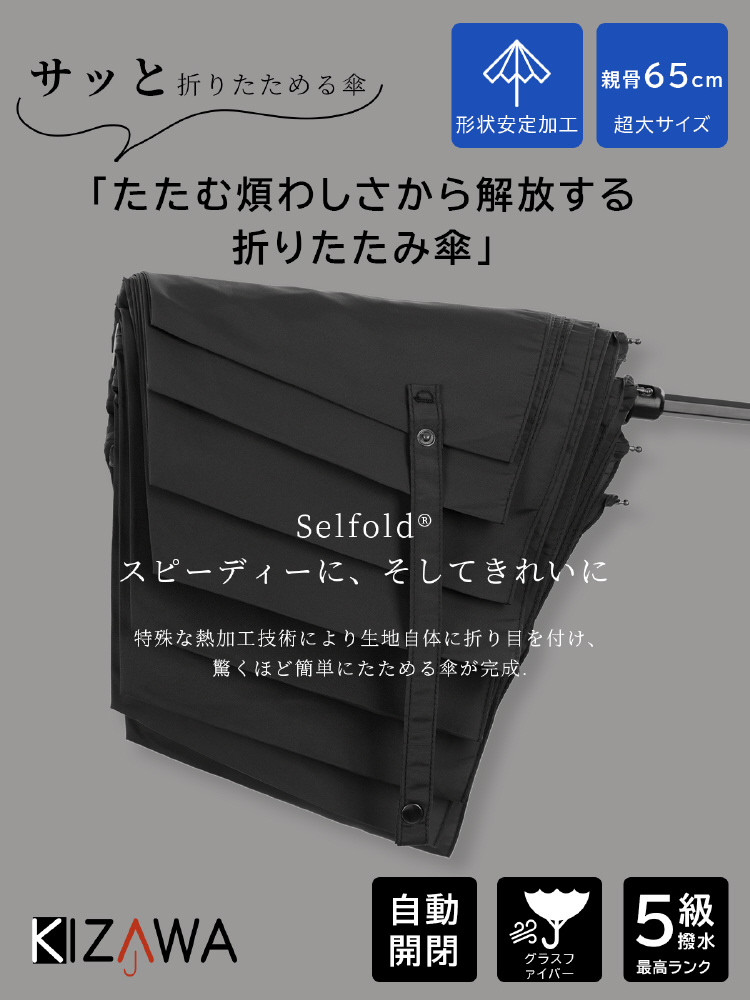 折りたたみ傘のたたみにくいという難点を解消するために開発した「Selfold」シリーズがついに登場しました!形状安定加工により、通常の折りたたみ傘よりも素早くたためます。また、収納時にはかさばらず、綺麗にまとめることができます。