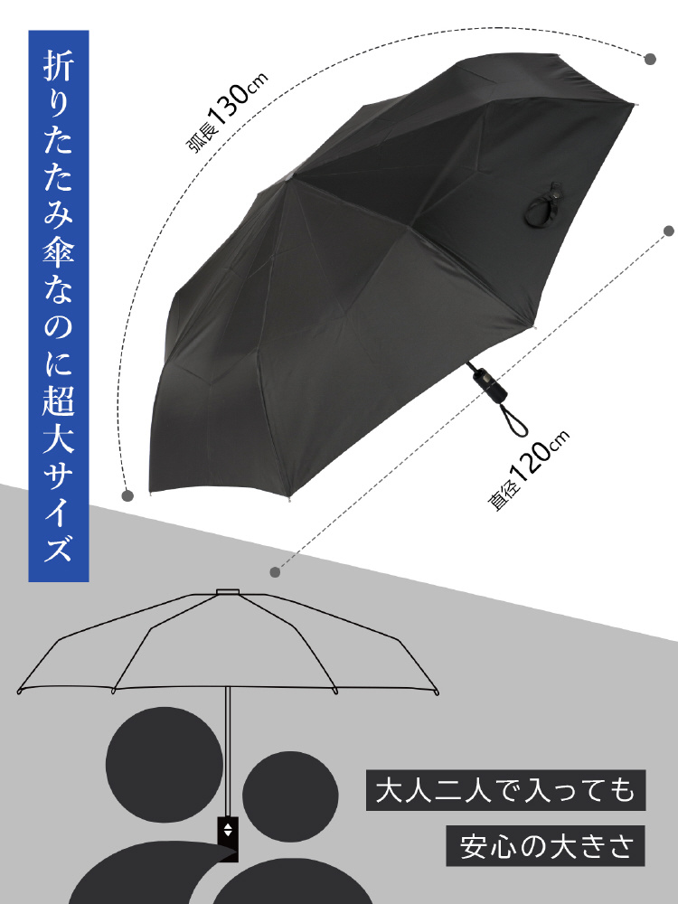 折りたたみ傘なのに超BIGサイズ!全長約67cm、親骨65cm、開いた時の直径約120cmです。大型長傘に匹敵する大きさなので、二人で歩く時も安心です。体格の大きい方でも、リュックを背負っていても濡れにくいです。また、親骨の先にグラスファイバーを使うことで強風を受け渡し、親骨の柔軟性と耐久力を向上しました。豪雨・強風でも安心です。