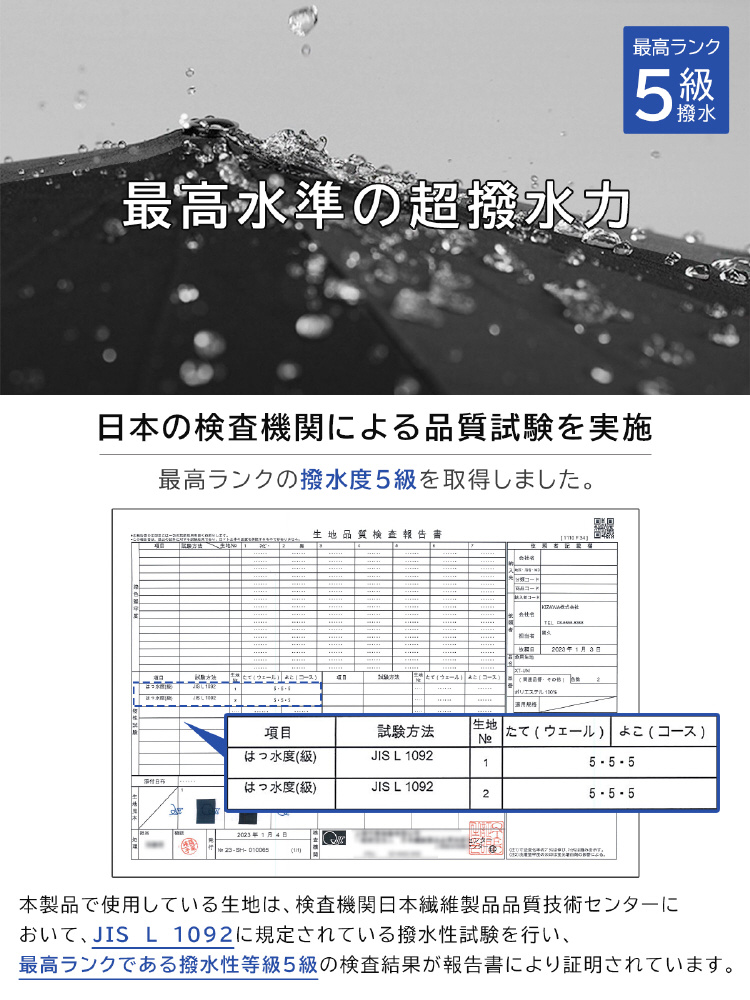 JIS L 1092に規定されている撥水性試験を行い、最高ランクである5級撥水の検査結果が報告書により証明されています。通常の傘生地より2倍の高密度30D生地を使用しており、その表面は非常に細く、水滴を吸収することなく弾きます。そのため、水切れがとても良く、傘を差した後は軽く振っていただくだけで水気が飛び、カバンにも気楽にしまうことが可能。梅雨対策には欠かせない優秀なアイテム!(2023年1月に「日本繊維製品品質技術センター」 (Q-TEC) におけるJIS L 1092 A法で品質検査を実施し、はっ水度5級の報告書を取得しています。)