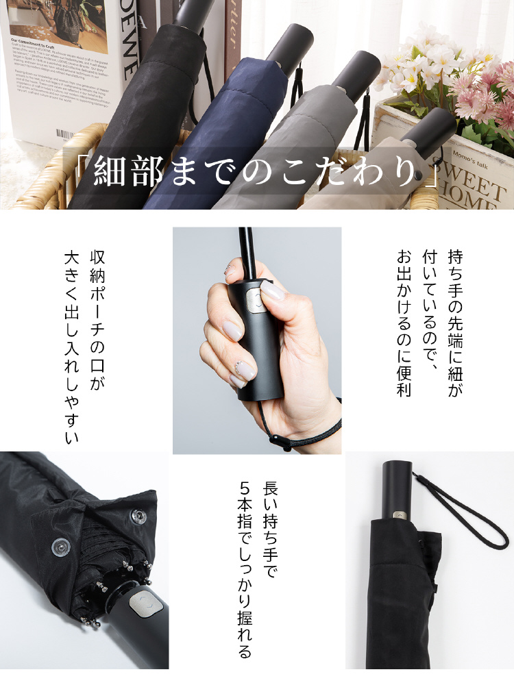 ワンタッチ自動開閉なので、片手が荷物で塞がっている時や車の乗り降り時など、軽く開閉ボタンを押すだけで開閉できますのでとても便利です。自動開閉機能に不意な飛び出しを防ぐ逆戻り防止機能搭載で、一般的な自動開閉折りたたみ傘より安全に閉じられます。