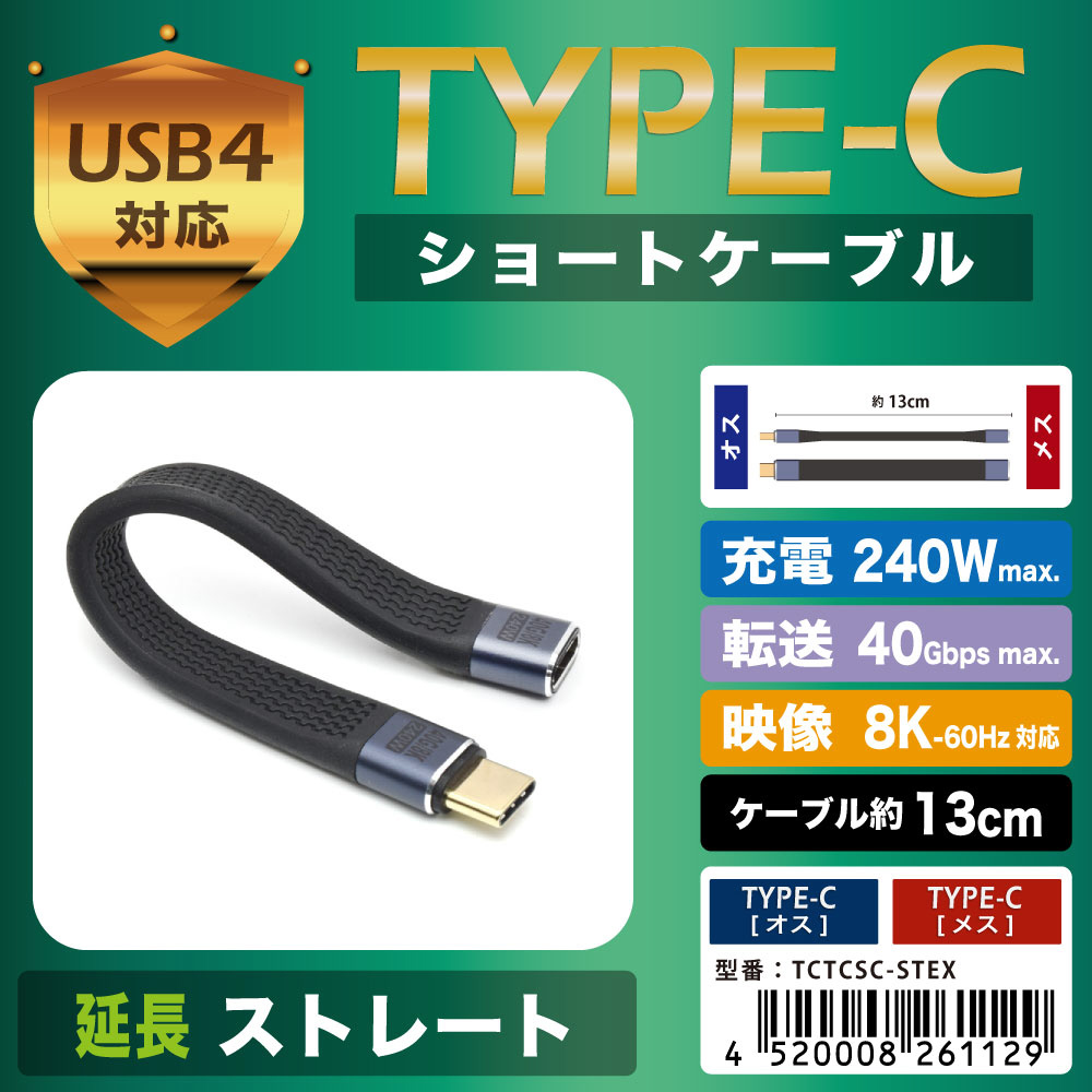 USB-C延長ケーブル [USB-C オス→メス USB-C /映像 /充電 /転送 /0.1m /8K /PD240W /USB4(40Gbps)] ストレート ブラック TCTCSC-STEX [8K]