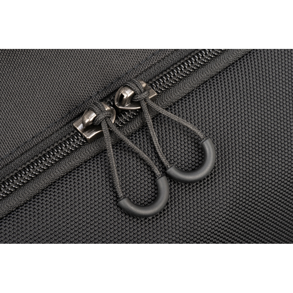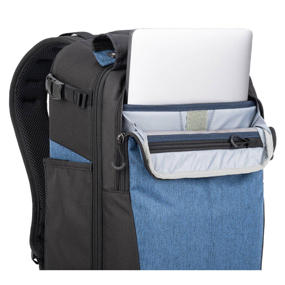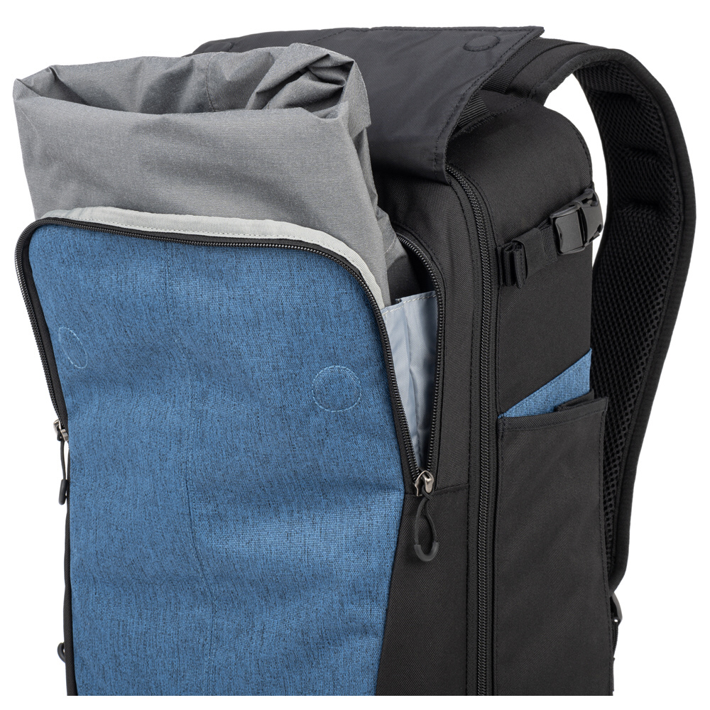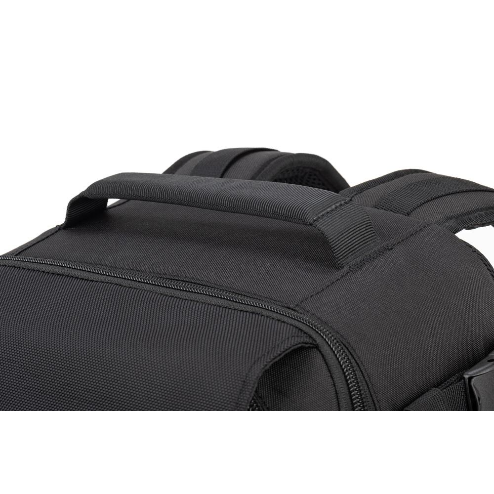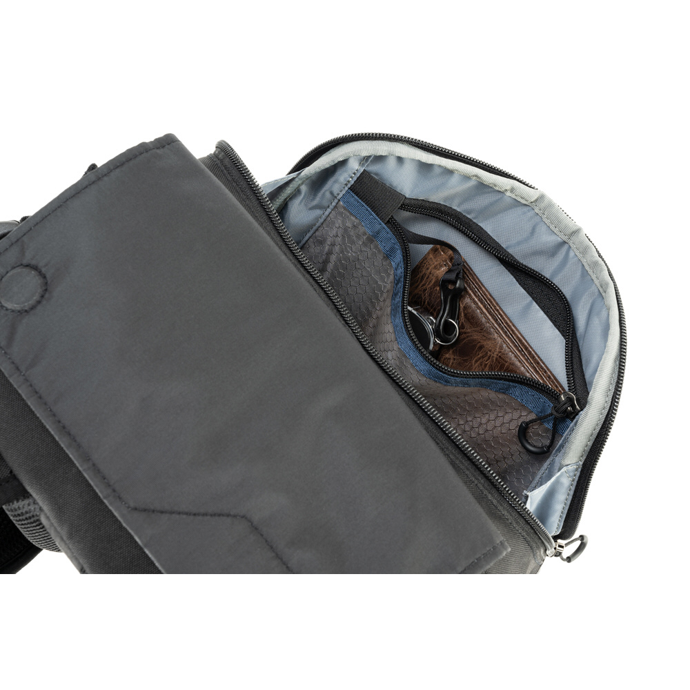 バッグの前面には5L相当のフロントポケットがあり、上蓋はマグネット式のためスムーズな開閉が可能です。フロントポケットには薄手のジャケットが収納可能で、中にはジッパー付きメッシュポケットもあり、鍵など小物の収納にも便利です。さらに14インチまでのノートPCを収納できるスリーブが付き、機材以外のアイテムの持ち運びにも困りません。