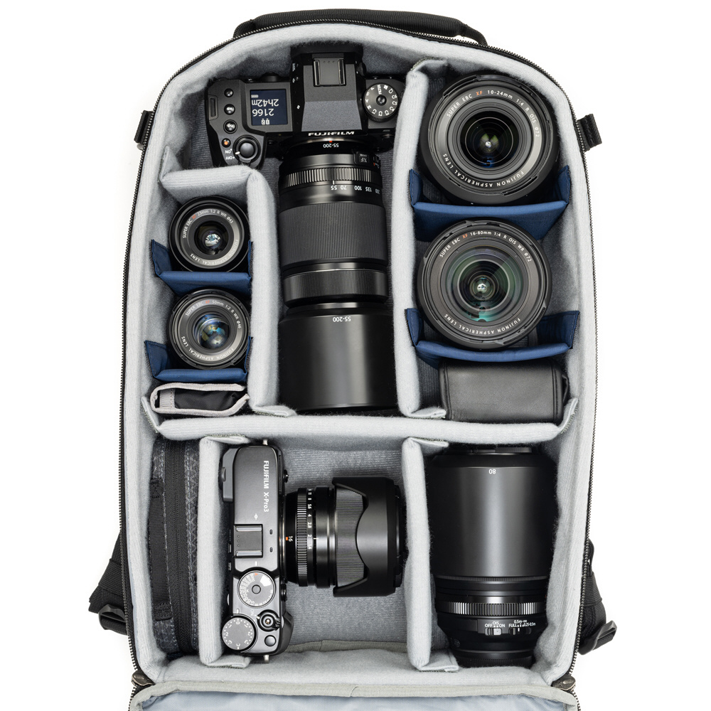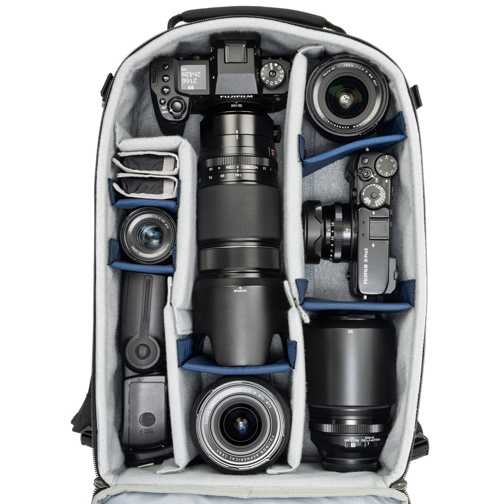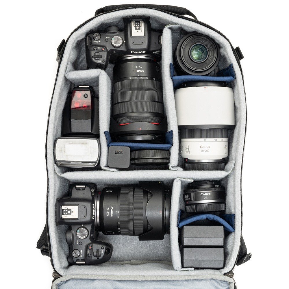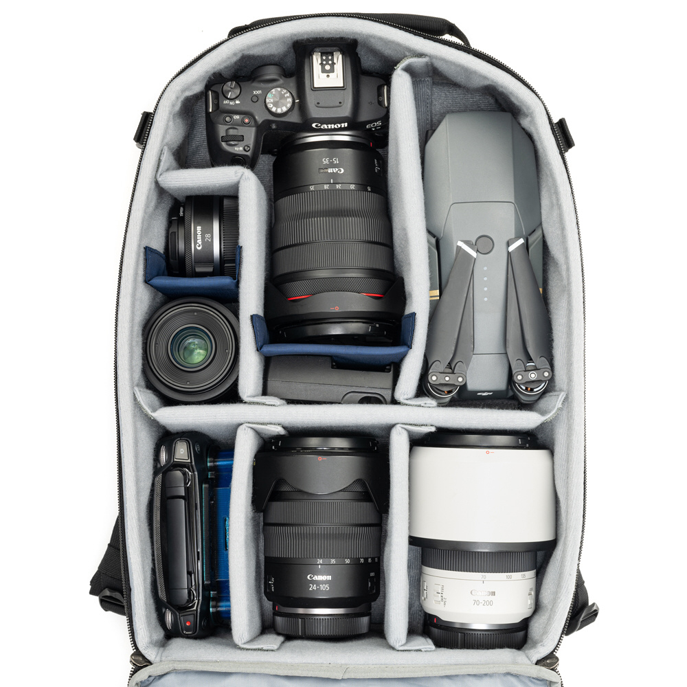 ミラーレスカメラ1台、4-6本のレンズ、アクセサリー、または70-200mm F2.8 を装着したフード付きミラーレスカメラ1台、レンズ数本、アクセサリーなどを収納可能です。