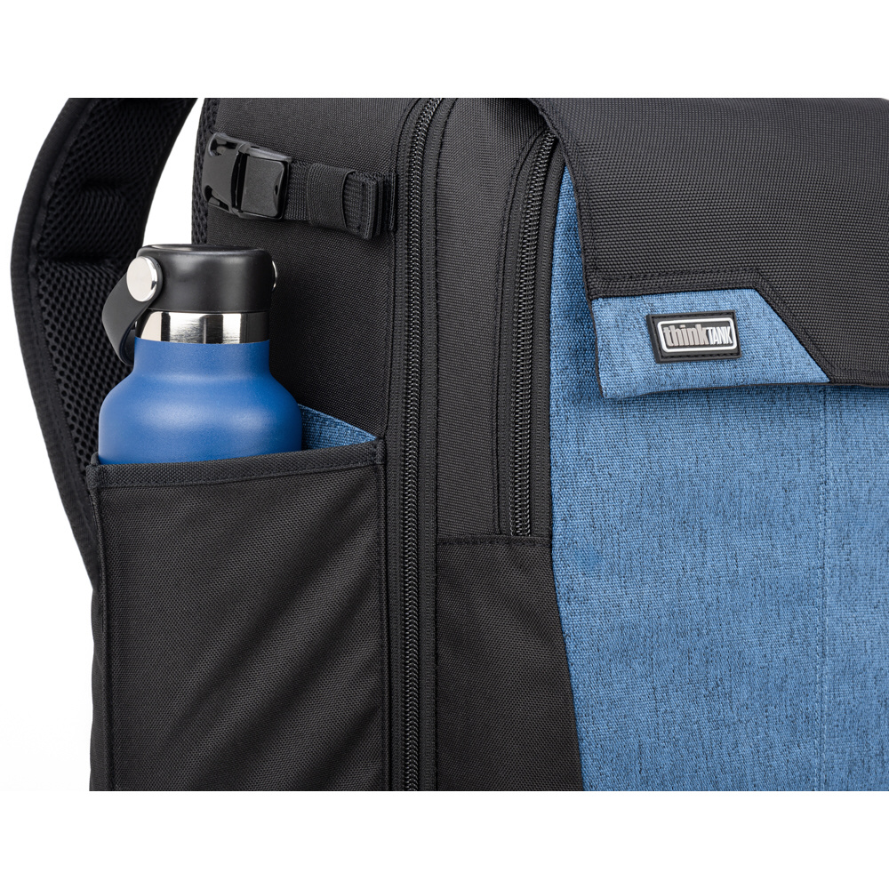 両サイドにはジッパーで拡張可能なウォーターボトルや小型三脚などを収納できるポケットがあり、三脚を固定できるベルトも備わっています。