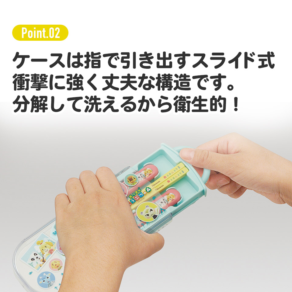 食器洗い乾燥機OKのお箸・フォーク・スプーンとケースのセットです。ケースは指で引き出すスライド式で、衝撃に強く丈夫な構造です。ケースは分解して洗えるから衛生的。おハシには名前を書けるスペース付き。ケース用の名前シールも付いてます。
