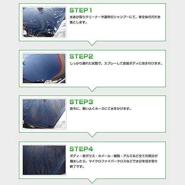 3.しっかりボディが濡れている状態で本液をスプレーで吹きかけた後、直ちに水で洗い流し、マイクロファイバークロスなどで拭き取ってください。
