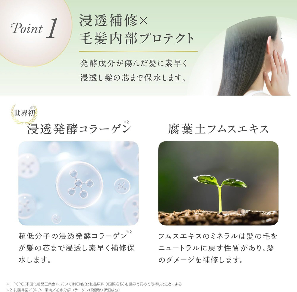 浸透発酵成分が髪の毛内部まで浸透しサラサラ髪へ導きます。