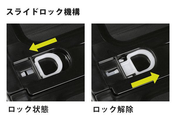 コンテナの蓋にスライドロック機構を設け、コンテナに収納している中身の飛び出しを防ぎます。