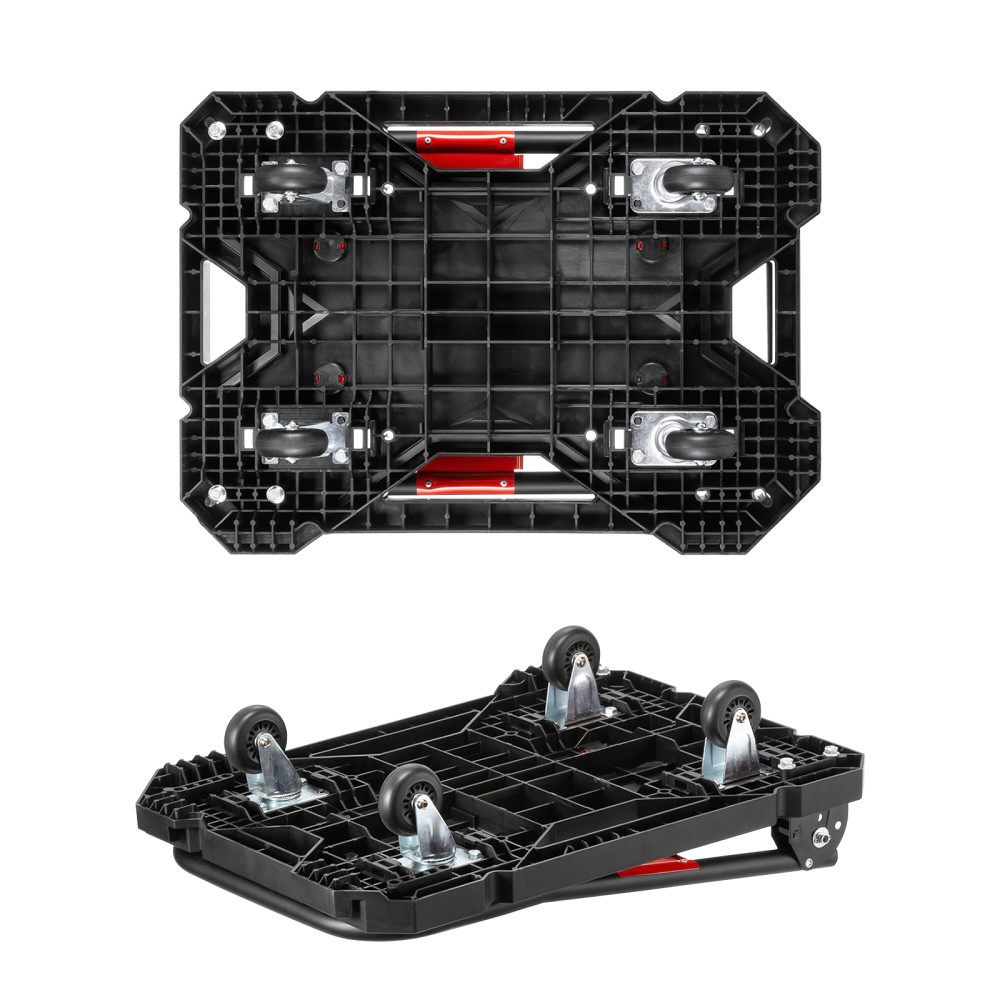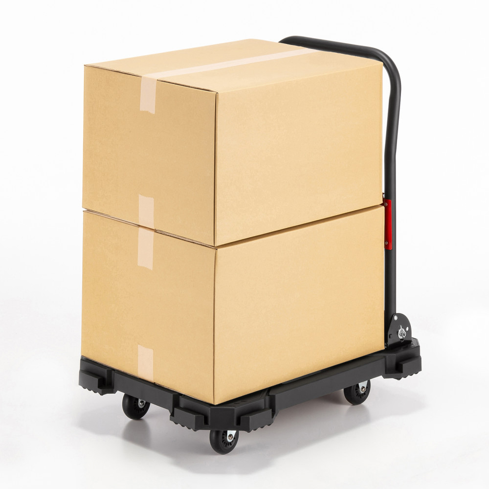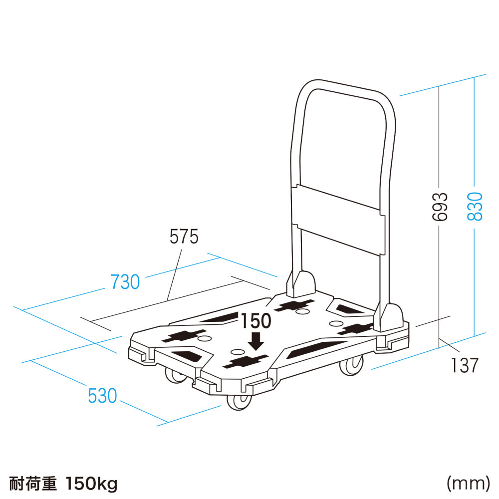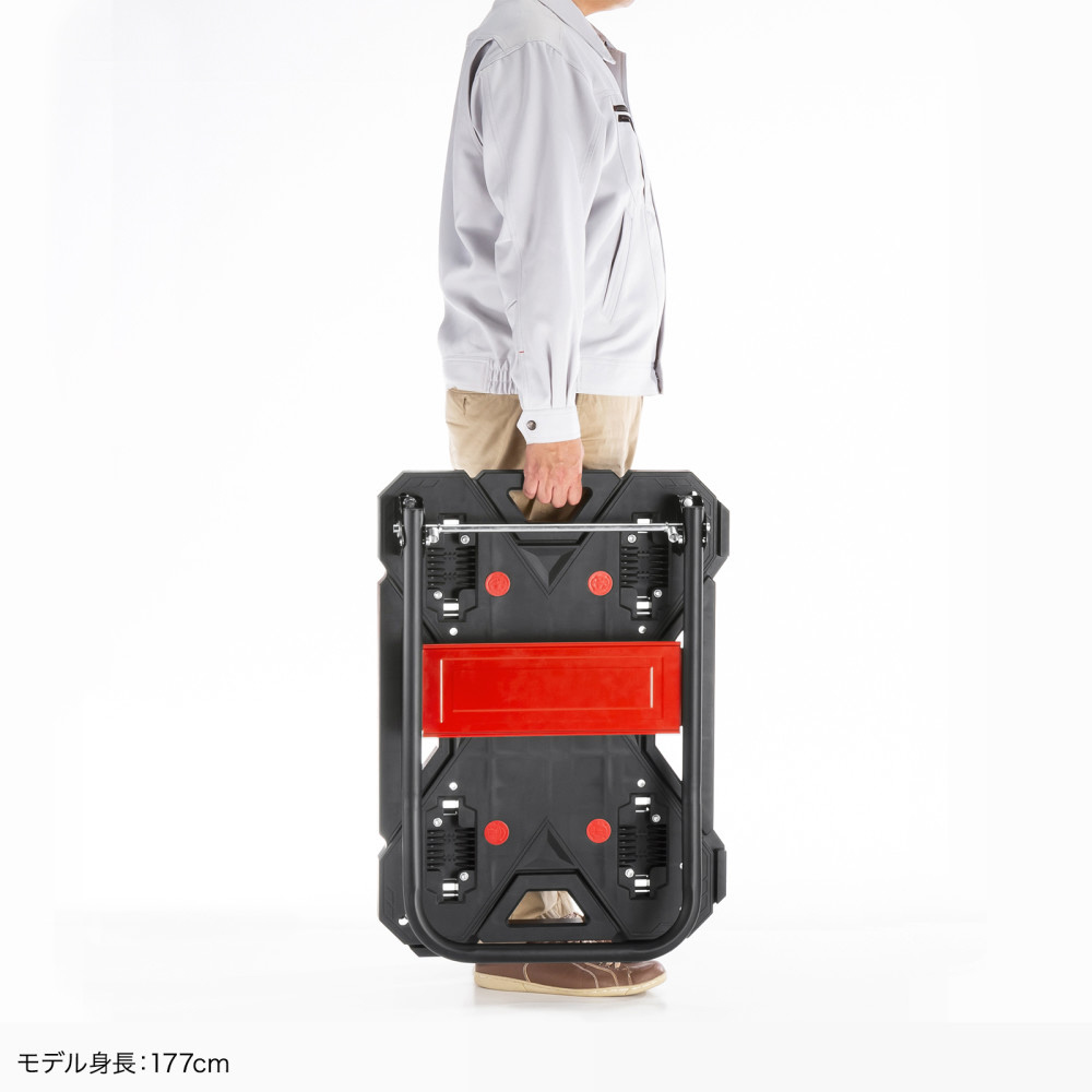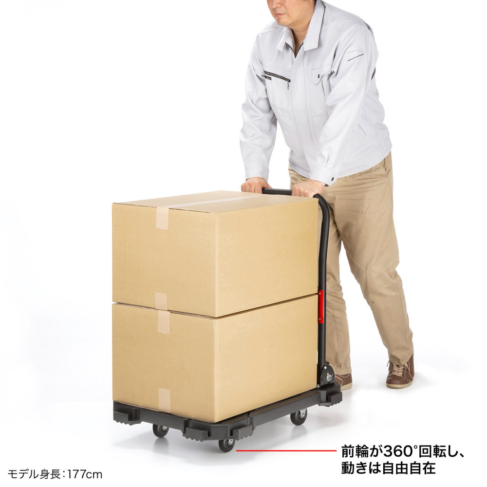 単体使用だけでなく、平台車を連結して荷台を拡張しても使える取っ手付き台車。