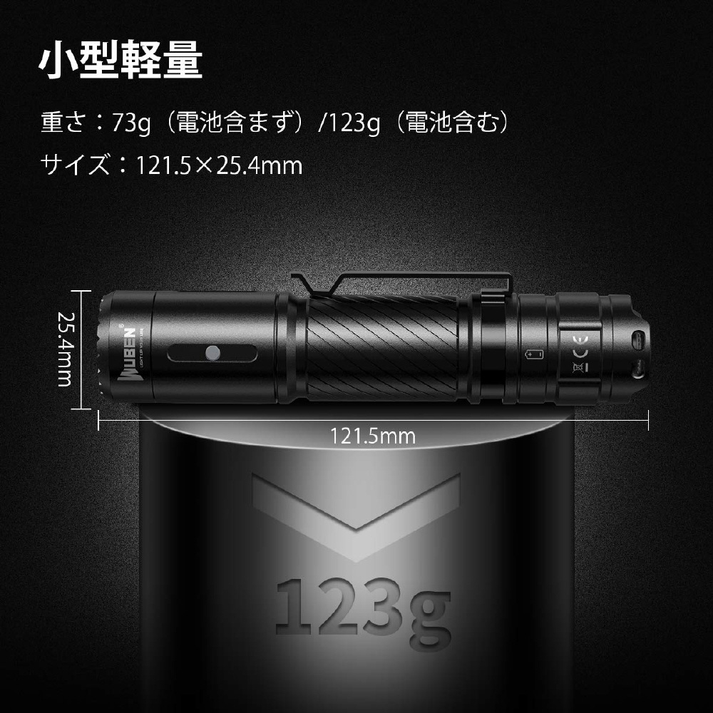 【小型なのに高輝度】WUBEN C3 充電式 懐中電灯はコンパクトなライト!僅かに73グラムなのに明るさ最大1200ルーメンを実現します。WUBEN C3懐中電灯は P9 LED素子を採用し、照射距離最大180メートルに達します。まだ、160°までの大きな光面、より広い視野。手に収まるサイズ:12.15×2.54cm;軽量:73g(電池含まず)/123g(電池含む)。