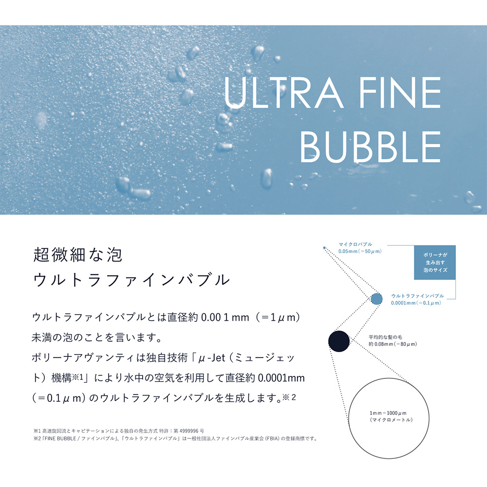 ボリーナアヴァンティは独自技術「μ-Jet(ミュージェット)機構※1」により水中の空気を利用して直径約0.001mm(=0.1μm)のウルトラファインババブルを生成します。※2