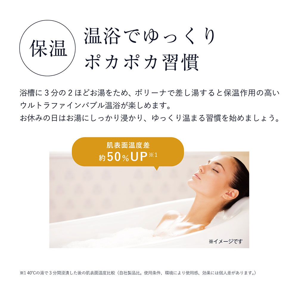 浴槽に3分の2ほどお湯をため、ボリーナで差し湯すると保温作用の高い、ウルトラファインバブル温浴が楽しめます。