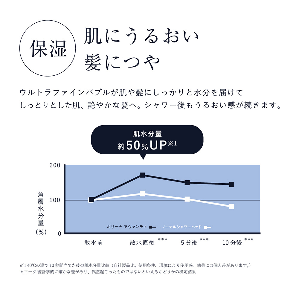 ウルトラファインバブルが肌や髪にしっかりと水分を届けて、しっとりとした肌、艶やかな髪へ。シャワー後もうるおい感が続きます。