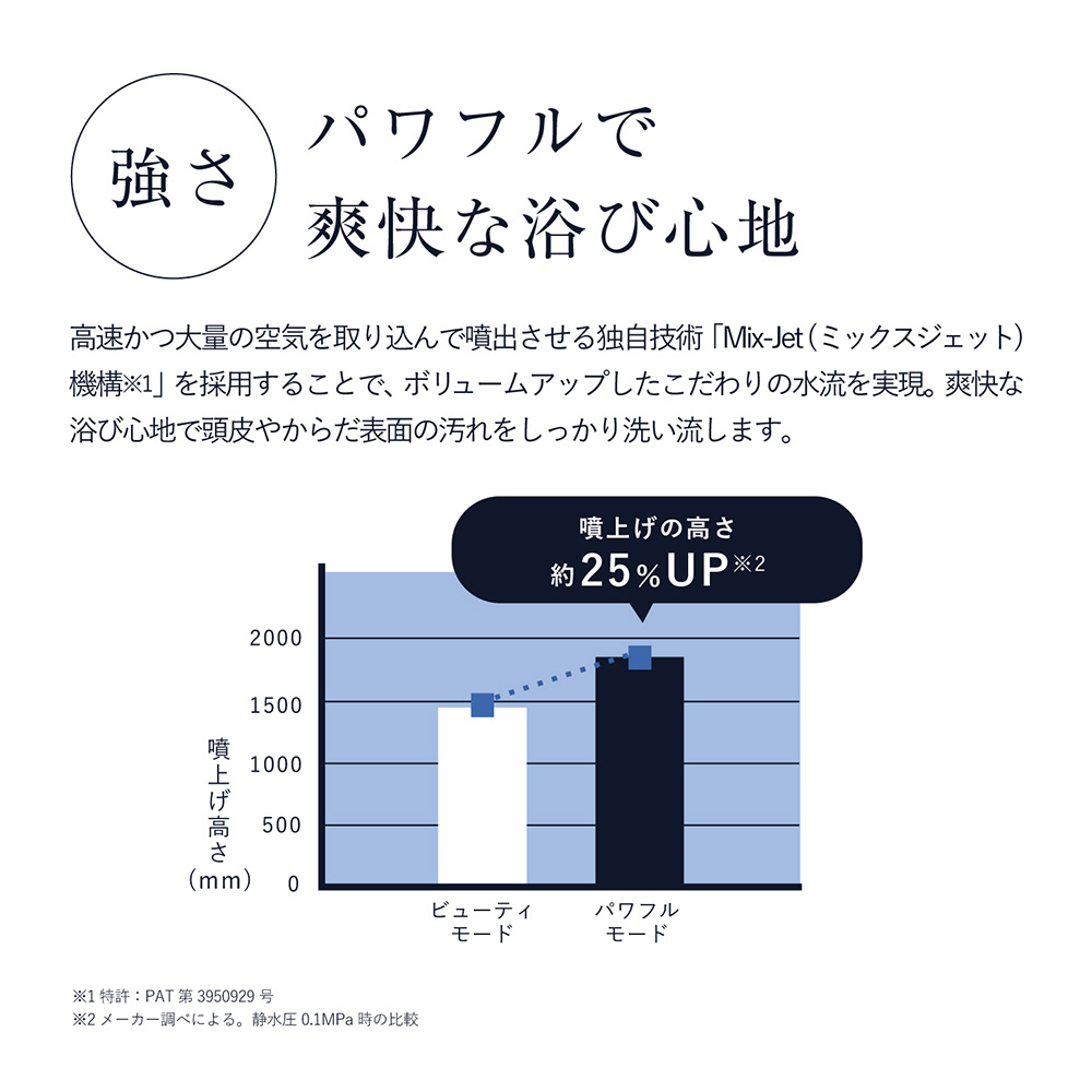 高速かつ大量の空気を取り込んで噴出させる独自技術「Mix-Jet(ミックスジェット)機構※3」を採用することで、ボリュームアップしたこだわりの水流を実現。爽快な浴び心地で頭皮や身体表面の汚れをしっかり洗い流します。