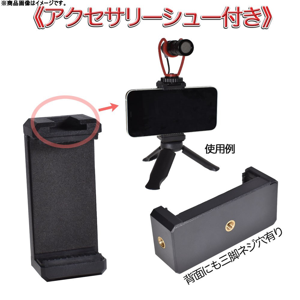幅8.3cmまでのスマホを三脚ネジ穴付ホルダーに挟み込んで使用します。 三脚への取り付け等にどうぞ。