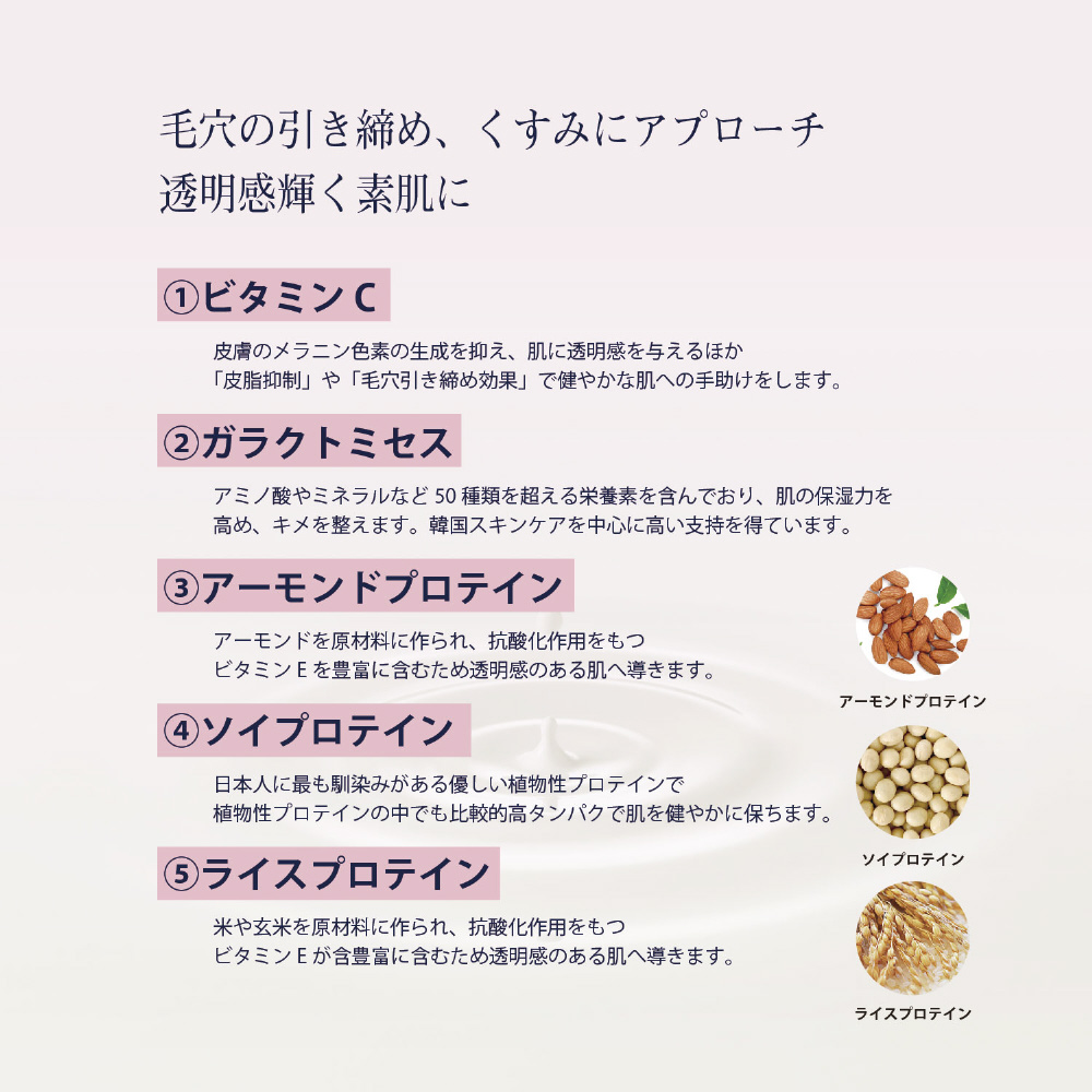 ビタミンC誘導体とスキンケアプロテイン配合、メルティな潤いで輝くような透明感のある素肌に導く。
