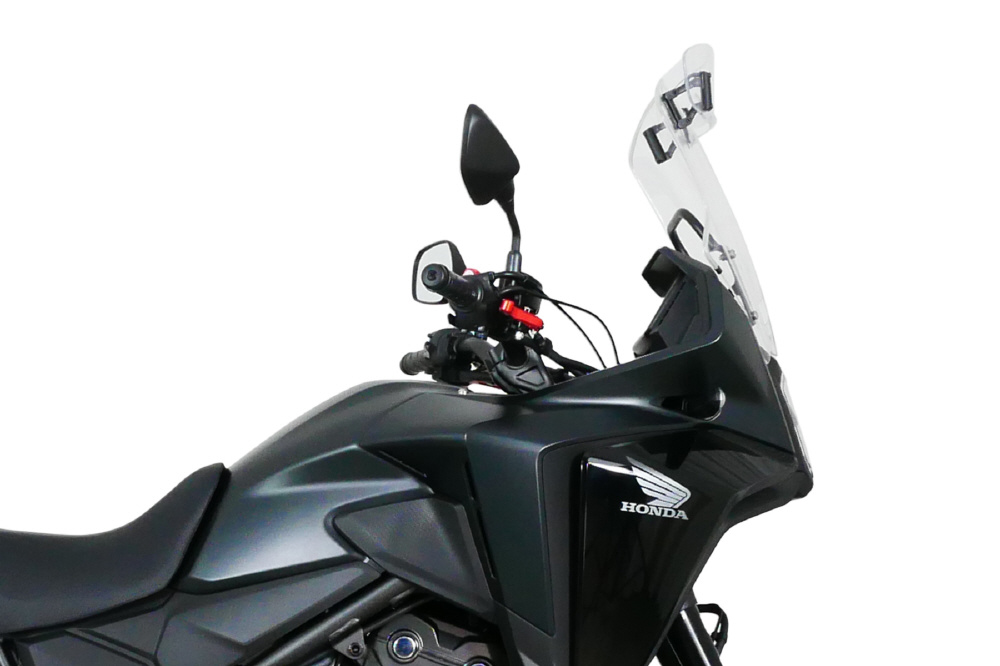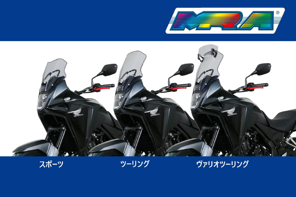 「スクリーン ヴァリオ ツーリング」は、スクリーンエンドに独自の可変フラップを持つスクリーンです。フラップは6段階に調節が可能でシチュエーションによって風の流れをコントロールできます。フラップ上部からの風とフラップ/スクリーンの隙間を通ってきた風が互いの勢いを打ち消し合うことで身体への風の抵抗を軽減。高速道路を多用するロングツーリング派のライダーにおすすめです。MRAは純正同様にスクリーン中央下部にダクトを設け、整流効果とハンドリングの最適化を図りました。